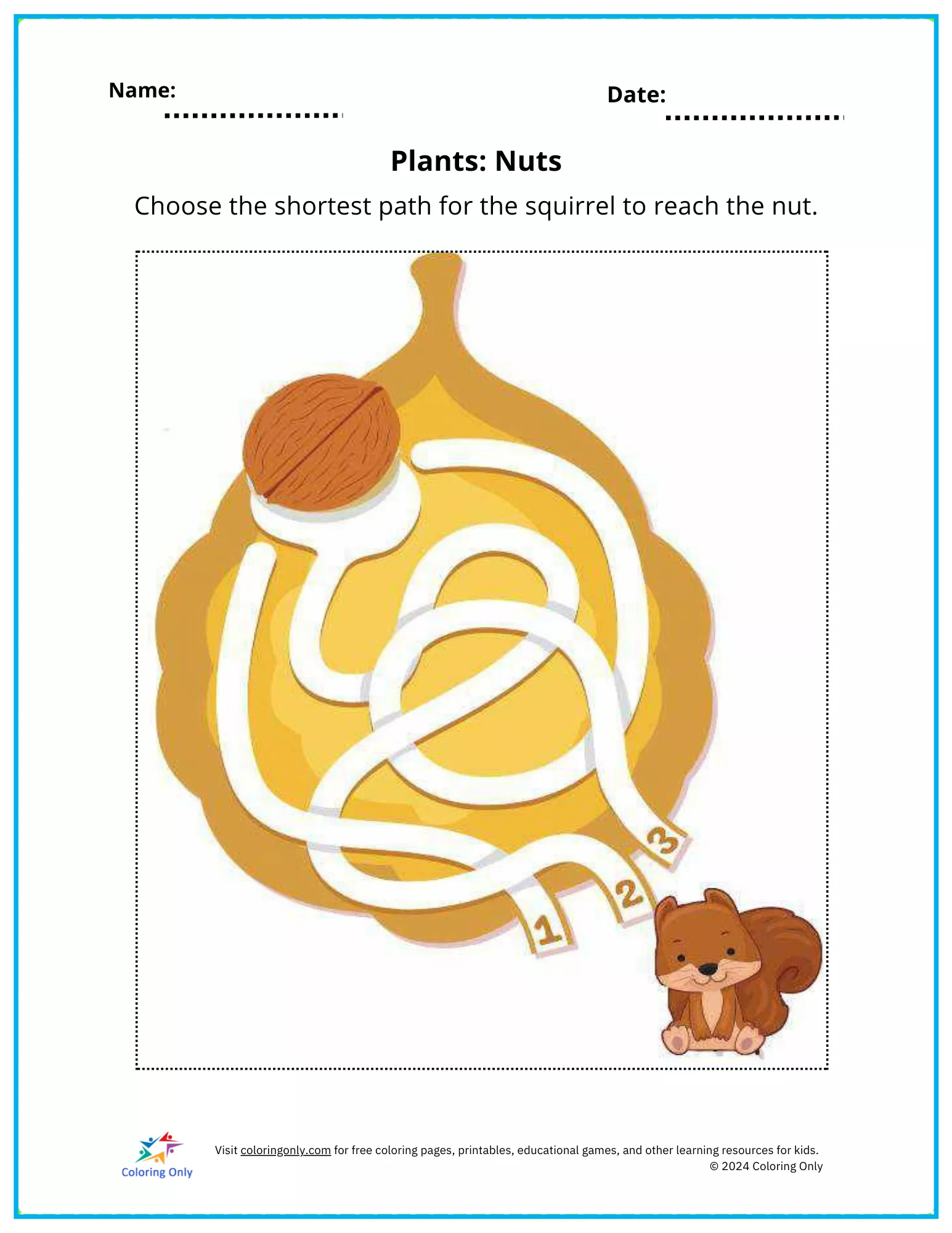The Plants: Nuts Free Printable Worksheet is a fun and engaging activity designed for kindergarten students. This worksheet challenges kids to help the squirrel find the shortest path to the nut by solving a simple maze. It encourages problem-solving, spatial reasoning, and fine motor skills, making it both entertaining and educational. Perfect for classroom or home use, the Plants: Nuts Free Printable Worksheet introduces young learners to basic pathfinding concepts while keeping them engaged with an adorable squirrel theme. Print this worksheet to enjoy an exciting learning experience.
