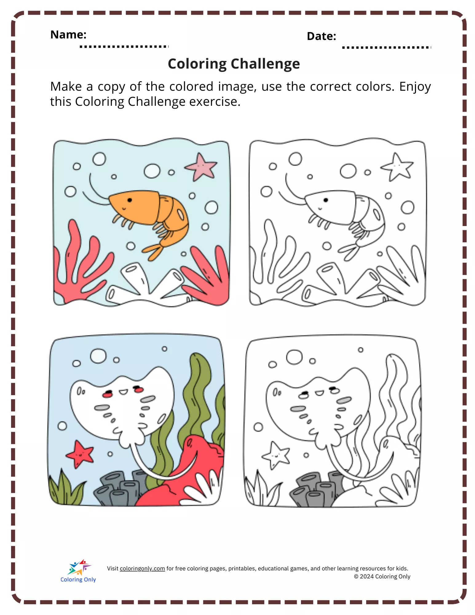 The Coloring Challenge Free Printable Worksheet is a fun and educational activity designed for preschoolers. This worksheet features two colorful ocean scenes with matching black-and-white versions, encouraging kids to replicate the colors accurately. By using the Coloring Challenge Free Printable Worksheet, children develop essential skills like color recognition, fine motor coordination, and attention to detail. This engaging exercise is perfect for preschool classrooms, homeschooling, or at-home practice. It promotes creativity while helping young learners improve their ability to follow visual instructions.