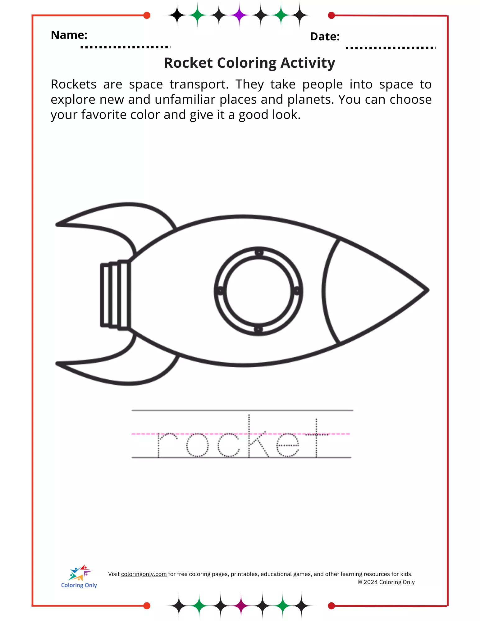 Launch into learning with this Rocket Coloring Activity Free Printable Worksheet! Designed for preschoolers, this engaging worksheet helps develop fine motor skills, creativity, and early writing abilities. The Rocket Coloring Activity Free Printable Worksheet features a simple yet exciting rocket illustration for kids to color, along with a tracing section to help them practice writing the word “rocket.” Perfect for home or classroom use, this fun activity encourages young learners to recognize space-related objects while enhancing their hand-eye coordination.