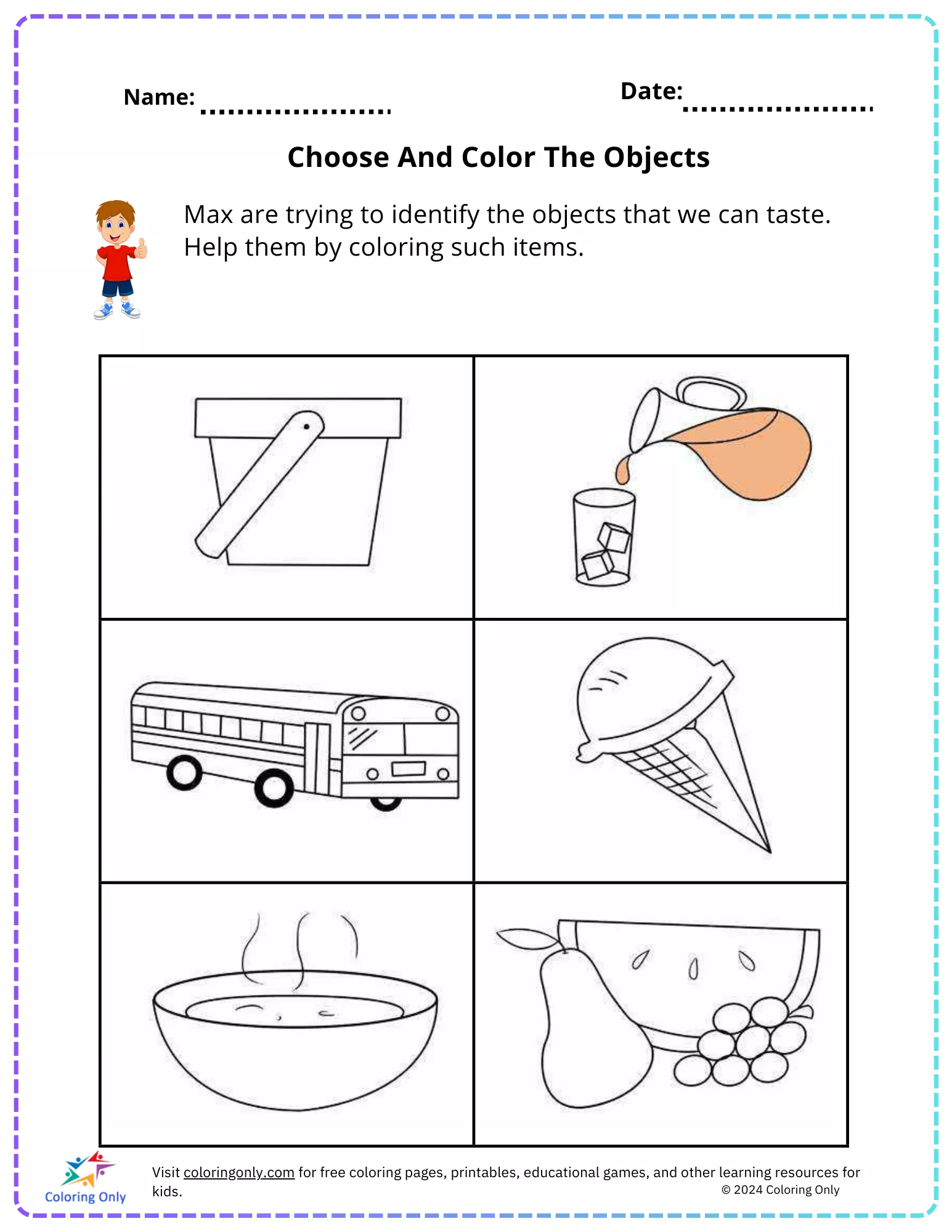 The "Choose And Color The Objects Free Printable Worksheet" is a fun and interactive activity designed for preschoolers to help them recognize objects that can be tasted. This worksheet features various images, and children are encouraged to identify and color only the items that are related to the sense of taste, such as ice cream or fruit. The "Choose And Color The Objects Free Printable Worksheet" is perfect for developing sensory awareness, cognitive skills, and creativity in young learners. This engaging activity makes learning about the senses enjoyable and helps reinforce the concept of taste in an entertaining way