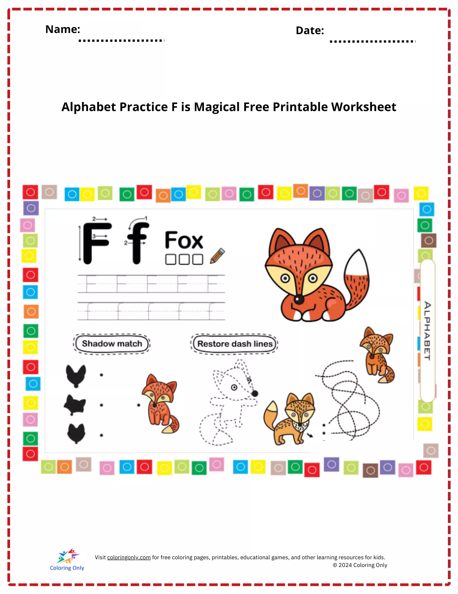 Let kids discover the letter F with this fun “F is for Fox” printable worksheet! Children can trace the letter F, match shadows, and restore dashed lines of cute foxes. Perfect for preschool and kindergarten alphabet learning.