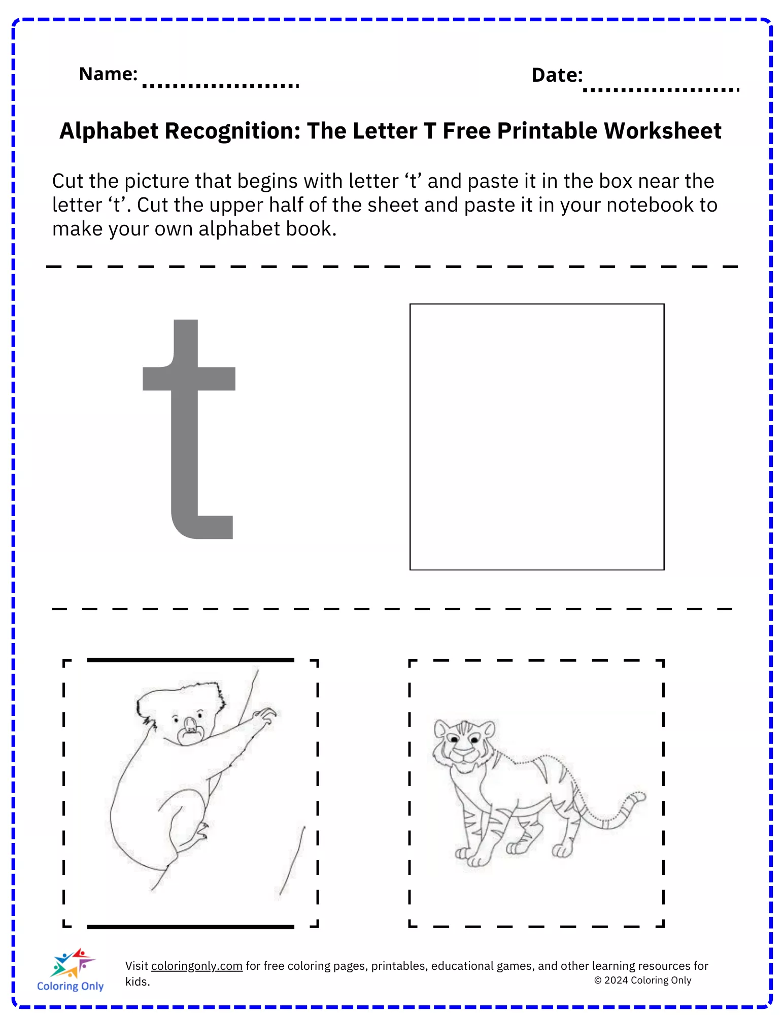 The "Alphabet Recognition: The Letter T Free Printable Worksheet Free Printable Worksheet" is a delightful activity designed for preschoolers to reinforce their understanding of the letter 'T.' This worksheet encourages children to identify, cut, and paste the pictures that begin with the letter 'T.' It’s an interactive task that boosts letter recognition and fine motor skills. By completing the "Alphabet Recognition: The Letter T Free Printable Worksheet Free Printable Worksheet," kids can also create their very own alphabet book, making learning both engaging and fun. This worksheet serves as an excellent tool for early literacy development.