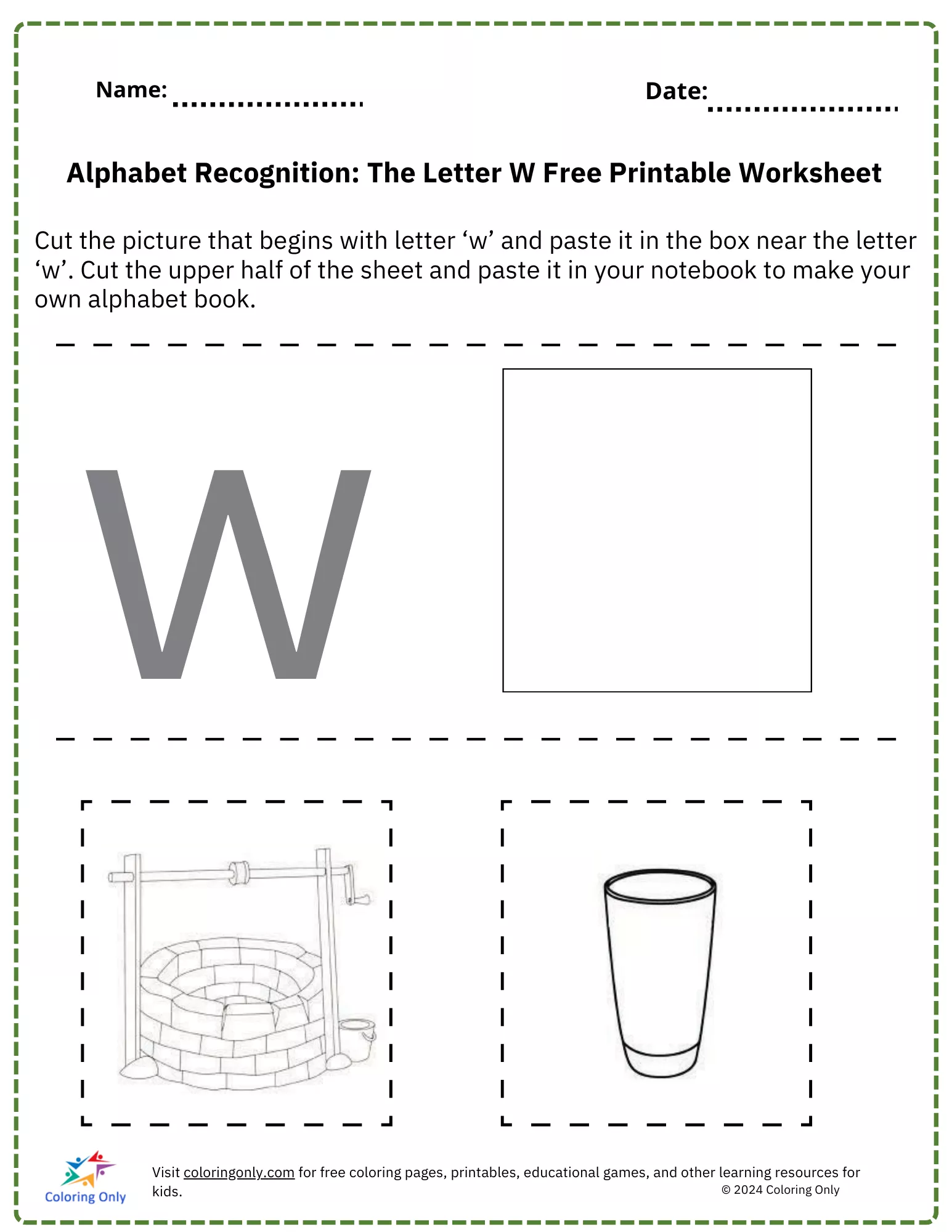 The Alphabet Recognition: The Letter W Free Printable Worksheet is a great resource for preschoolers to learn the letter 'W' through a hands-on activity. Children can cut out the picture that begins with the letter ‘W’ and paste it into the designated box. This worksheet encourages early literacy skills, as well as fine motor development through cutting and pasting. After completing the activity, kids can paste the sheet into their notebooks to build their own alphabet book. It's an engaging and educational tool for reinforcing letter recognition in a fun and interactive way, making learning enjoyable for young learners.