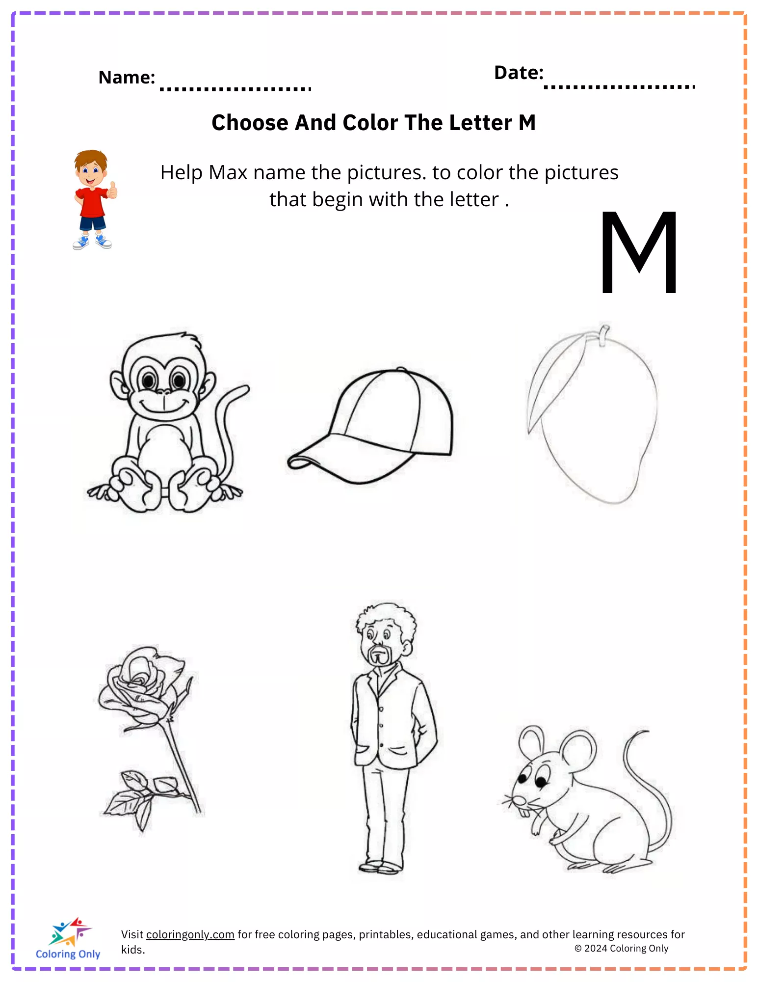 Introduce your preschooler to the world of letters with the "Choose And Color The Letter M Free Printable Worksheet." This engaging activity helps children identify and color pictures that begin with the letter M. Assist Max in naming the pictures and encourage your child to color them, reinforcing their understanding of words that start with M. This "Choose And Color The Letter M Free Printable Worksheet" is perfect for classroom activities or home learning, providing a fun and educational way to enhance early literacy skills.