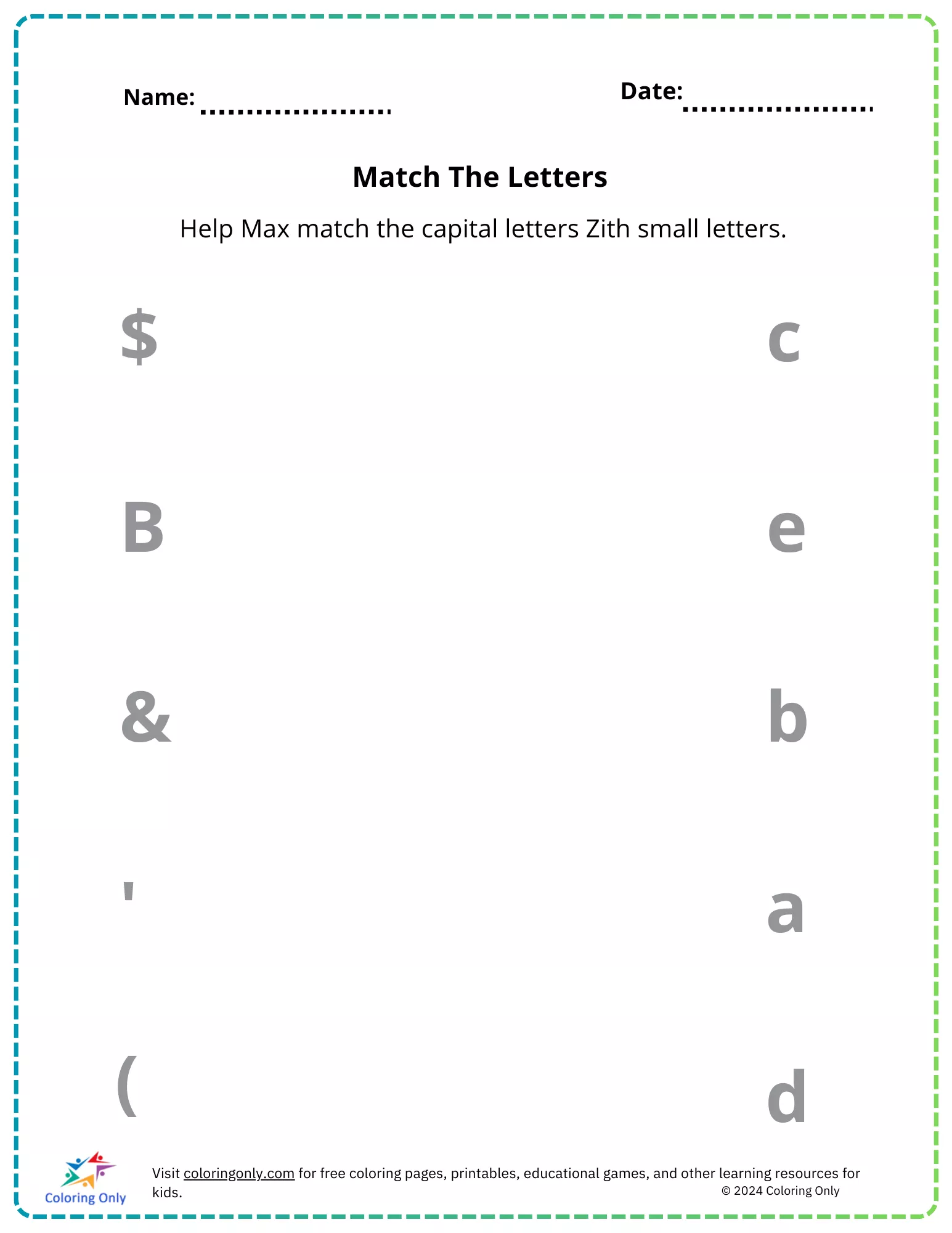 The "Match The Letters Free Printable Worksheet" is a fun and interactive activity designed for preschoolers to help them practice letter recognition and matching skills. In this worksheet, children are tasked with matching capital letters with their corresponding small letters. This exercise not only reinforces the understanding of the alphabet but also helps in improving hand-eye coordination as they draw lines to connect the matching pairs. The "Match The Letters Free Printable Worksheet" is an excellent tool for early learners to build a strong foundation in literacy in a playful and engaging way.