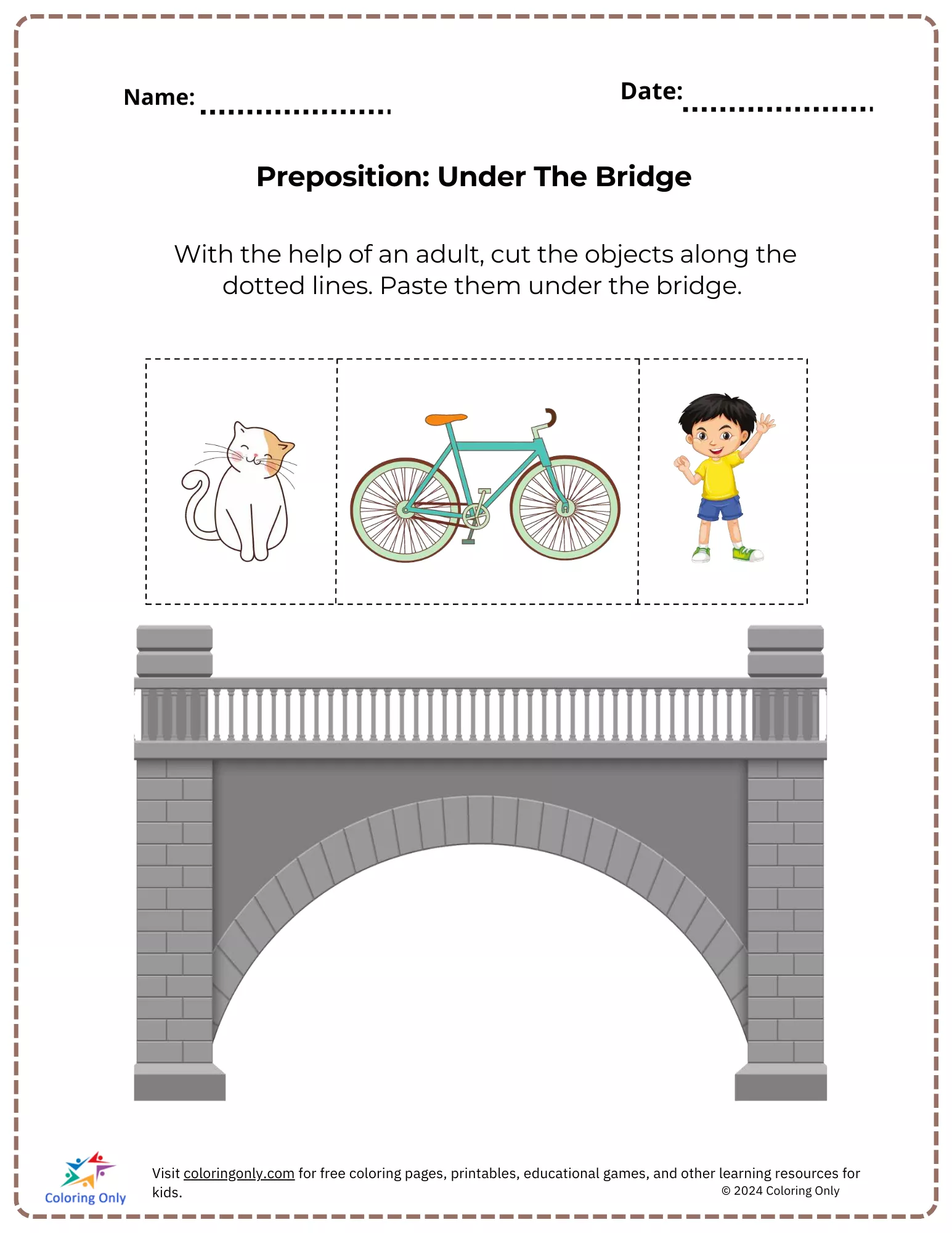 The "Preposition: Under The Bridge Free Printable Worksheet" is an engaging and interactive activity designed for preschoolers to learn about prepositions, specifically focusing on the concept of "under." In this worksheet, children are encouraged to cut out the objects—a cat, a bicycle, and a child—and paste them under the bridge, reinforcing their understanding of spatial relationships. This hands-on activity not only builds language skills but also enhances fine motor skills through cutting and pasting. The "Preposition: Under The Bridge Free Printable Worksheet" is an excellent resource for early learning, making education fun and effective.