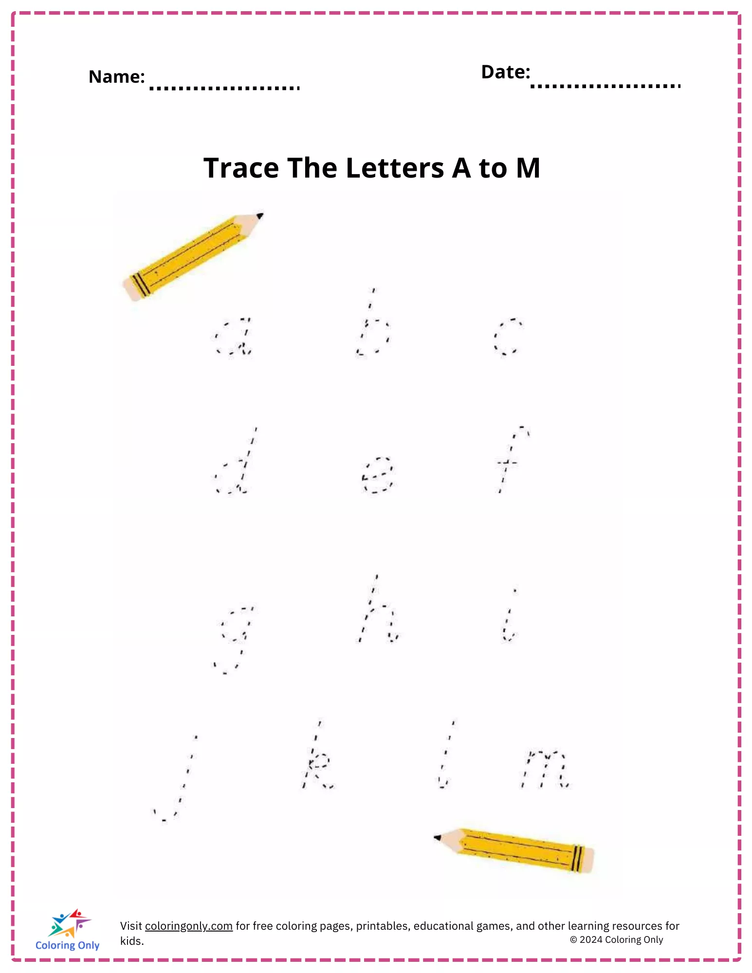 Engage your preschoolers in a fun and educational activity with this "Trace The Letters A to M Free Printable Worksheet." This worksheet is designed to help young learners practice tracing the lowercase letters from 'a' to 'm'. Tracing helps children develop fine motor skills and improves their ability to recognize and write each letter. The "Trace The Letters A to M Free Printable Worksheet" is an excellent resource for parents and teachers looking to provide a hands-on learning experience. Encourage your kids to use a pencil or crayon to trace over the dotted lines, making learning the alphabet an enjoyable process.