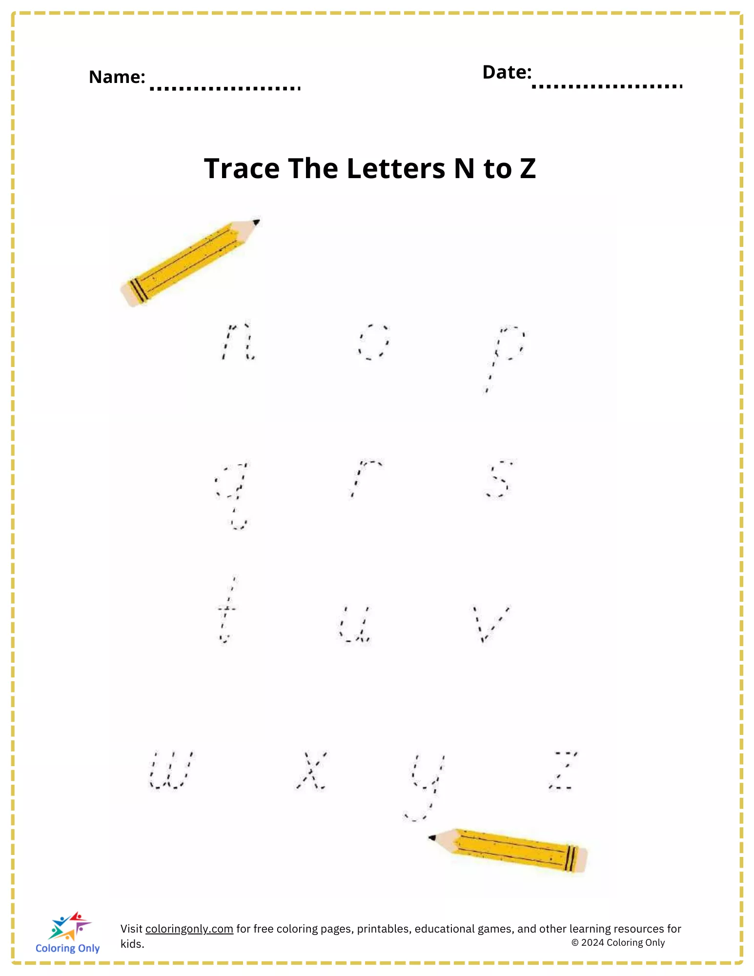 Help your preschoolers develop their letter recognition and fine motor skills with this engaging "Trace the Letters Free Printable Worksheet." This worksheet is designed to make learning the alphabet fun and interactive. Children can trace lowercase letters from 'n' to 'z', enhancing their ability to write and recognize each letter. The "Trace the Letters Free Printable Worksheet" is an excellent resource for both parents and educators to provide a hands-on activity that reinforces alphabet knowledge. Encourage your little learners to use a pencil or crayon to trace over the dotted lines, making the process enjoyable and educational.