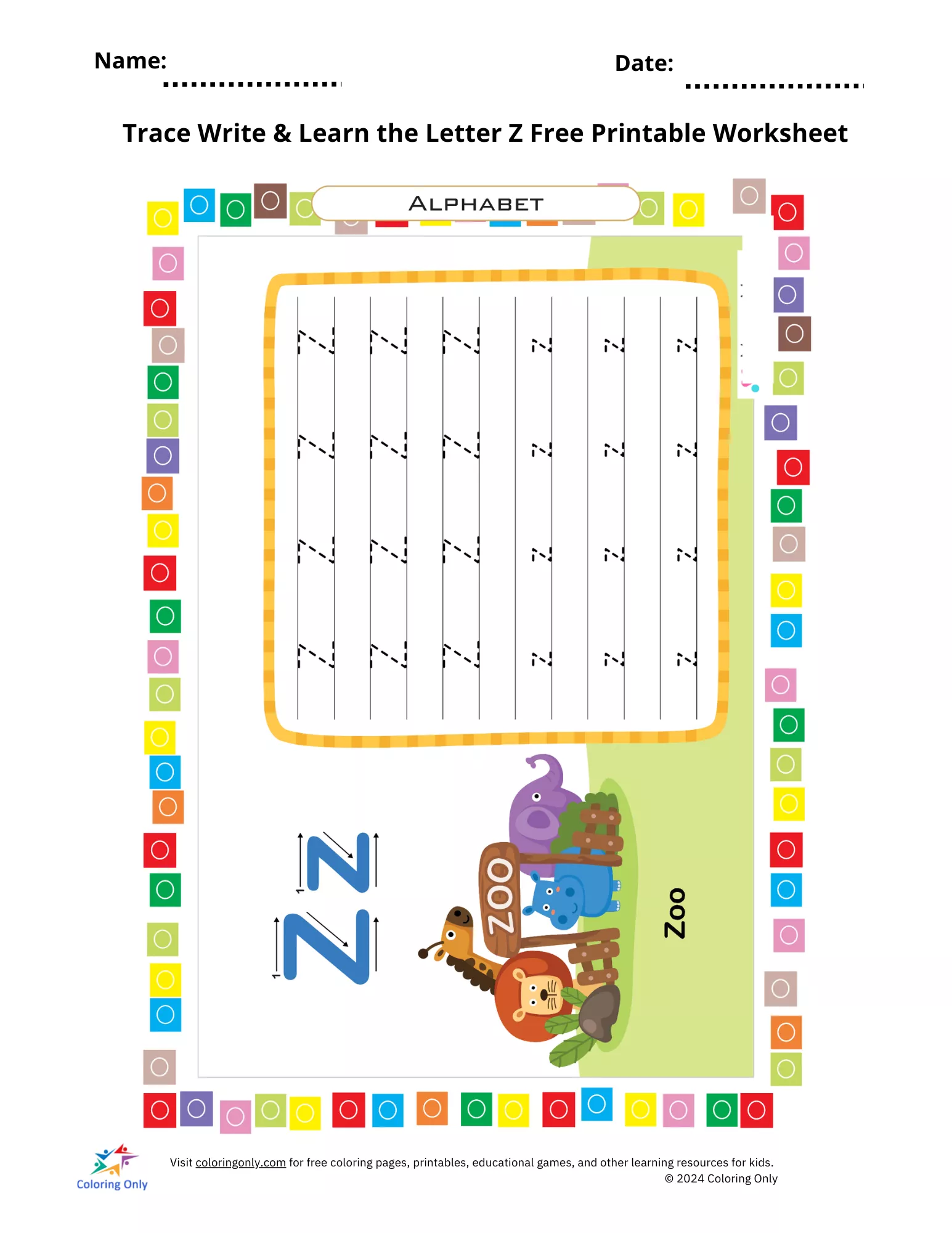 This fun and free printable worksheet helps preschoolers learn the letter "Z". Kids can trace both uppercase and lowercase "Z" while enjoying a cute zoo-themed picture. It’s a simple and joyful way to build letter writing and recognition skills in early learners.