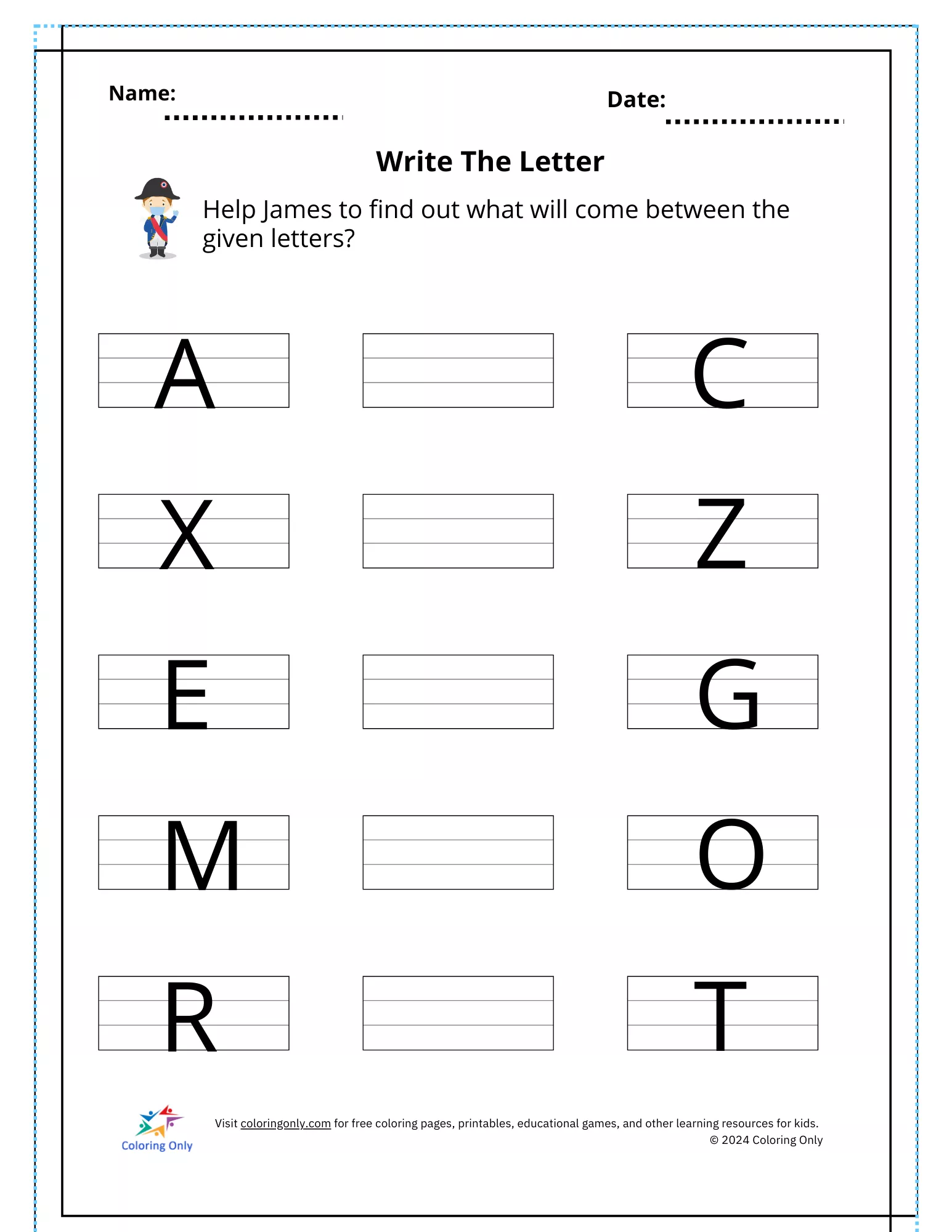The Write The Letter Free Printable Worksheet is an engaging and educational activity tailored for preschoolers to strengthen their alphabet sequencing and letter identification skills. In this worksheet, children help James figure out the missing letters that come between the given letters. The structured design and clear layout make it easy for young learners to focus and practice writing. This Write The Letter Free Printable Worksheet is perfect for enhancing early literacy skills while making learning fun and interactive. Ideal for use in classrooms or at home, it promotes cognitive development and fine motor skills in an enjoyable way.