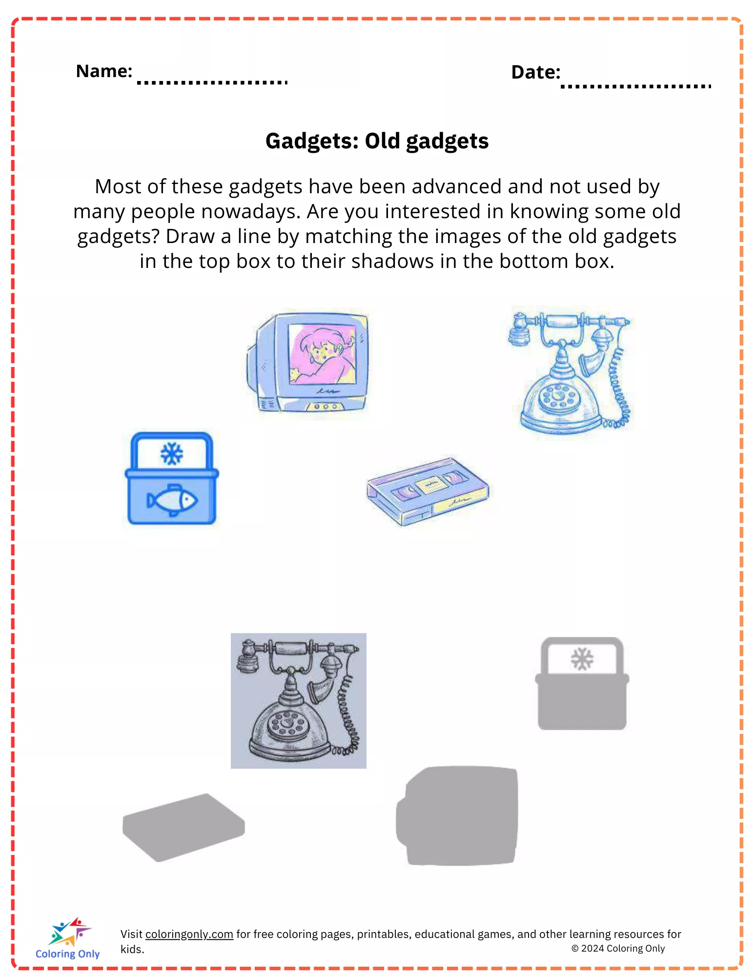 The Gadgets: Old Gadgets Free Printable Worksheet is an engaging activity designed for preschoolers to explore and learn about older technology. This worksheet features images of classic gadgets like rotary phones and old televisions. Children can develop their visual recognition and matching skills by drawing lines to match the old gadgets with their corresponding shadows. This fun and educational Gadgets: Old Gadgets Free Printable Worksheet helps kids understand how technology has evolved over time while enhancing their cognitive skills through play.