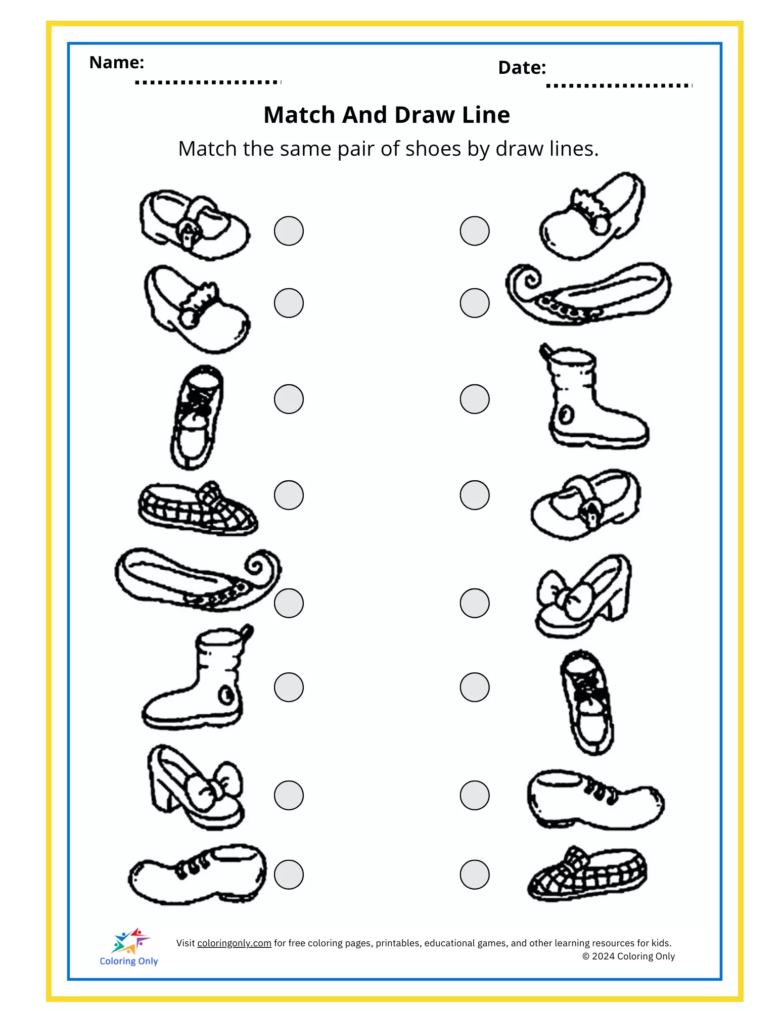 The Match And Draw Line Free Printable Worksheet is an engaging activity for preschoolers to enhance their visual discrimination and fine motor skills. In this worksheet, children are tasked to identify matching pairs of shoes and draw lines to connect them. This fun and educational exercise promotes concentration, hand-eye coordination, and critical thinking while keeping little learners entertained. The Match And Draw Line Free Printable Worksheet is ideal for at-home learning or classroom activities, helping children develop early matching and observational skills in a playful and interactive way.