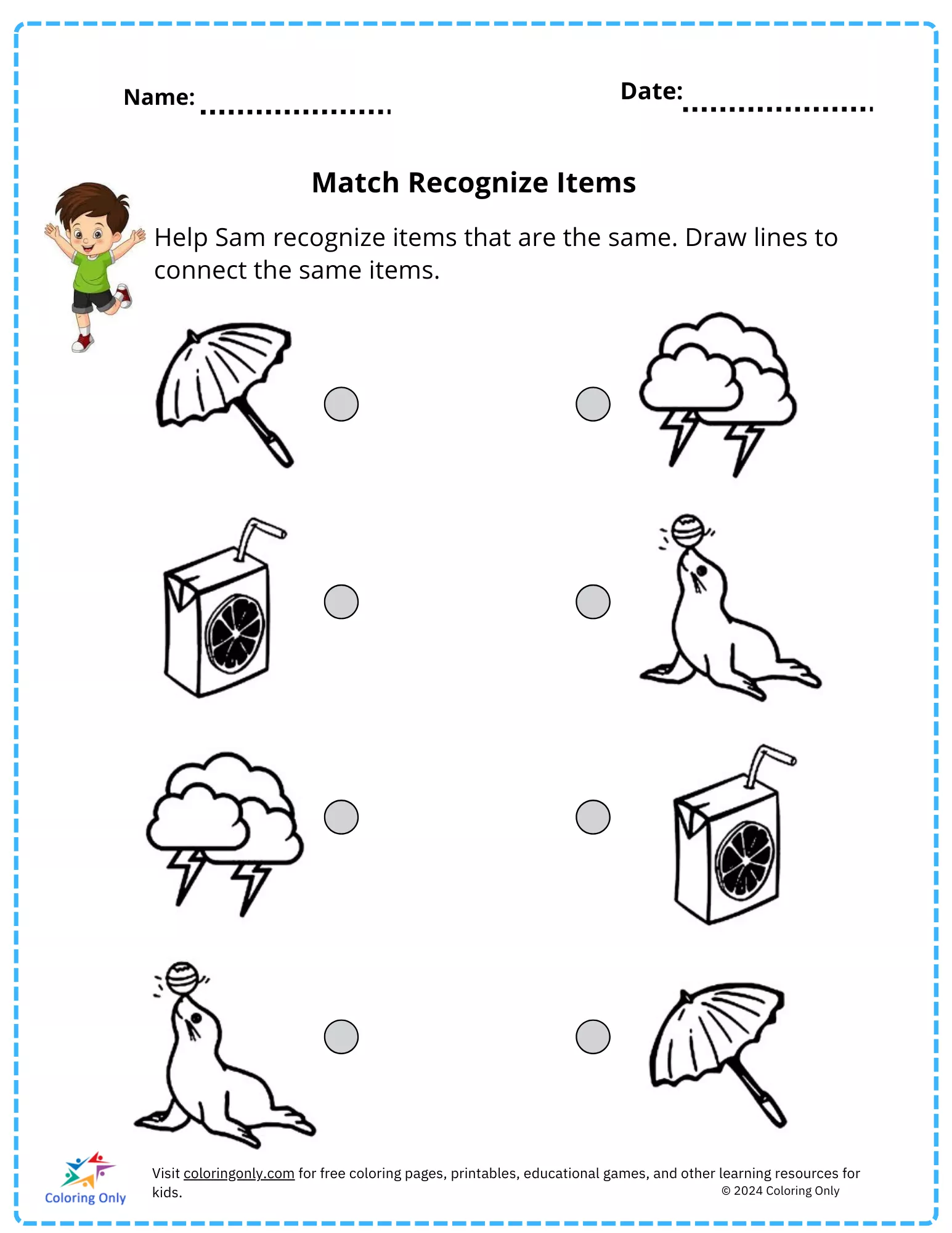 The "Match Recognize Items Free Printable Worksheet" is an engaging and fun activity designed for Preschool students. This worksheet helps children enhance their cognitive skills by matching pairs of identical objects, such as umbrellas, juice boxes, clouds, and seals. It encourages visual recognition and concentration as kids draw lines to connect matching images. The "Match Recognize Items Free Printable Worksheet" is perfect for classroom use or at home to support early learning and development. It makes learning enjoyable while promoting problem-solving and attention to detail.