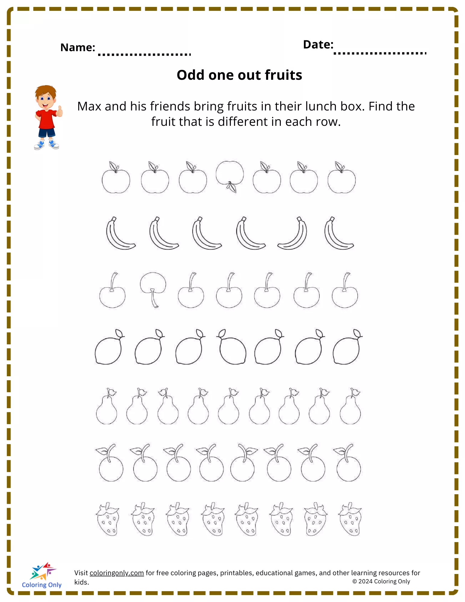 The "Odd One Out Fruits Free Printable Worksheet" is a fun and engaging activity designed for preschoolers to develop their observation and critical thinking skills. In this worksheet, Max and his friends bring different fruits in their lunch boxes, and the challenge is to find the fruit that is different in each row. This activity not only enhances visual discrimination abilities but also reinforces fruit recognition. The "Odd One Out Fruits Free Printable Worksheet" is an excellent tool for helping young children improve their attention to detail while enjoying a playful learning experience.