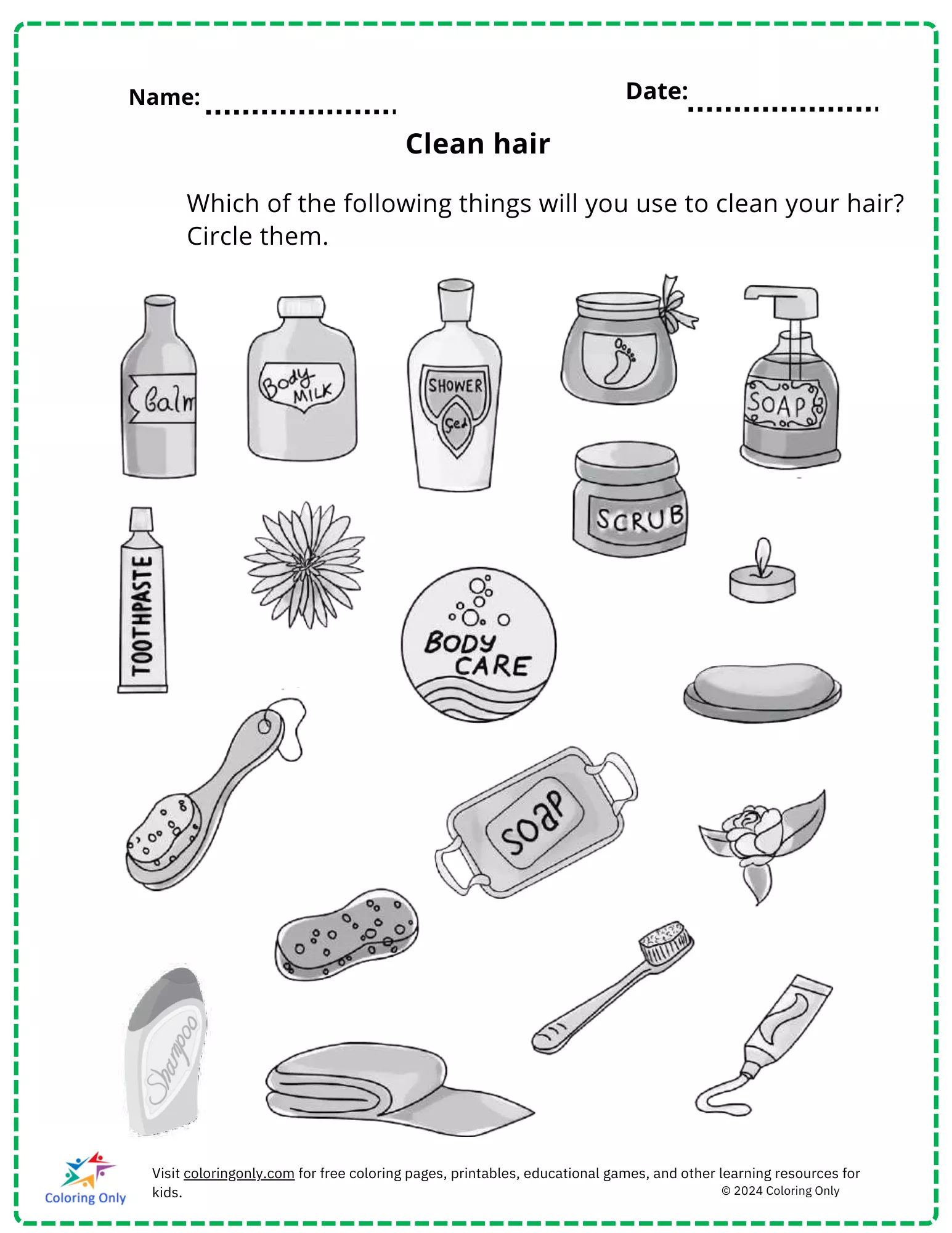 The "Clean Hair Free Printable Worksheet" is an engaging and educational activity designed for preschoolers to learn about hair hygiene. In this worksheet, children are tasked with identifying and circling the items that are used to clean their hair, such as shampoo and conditioner. This fun and interactive "Clean Hair Free Printable Worksheet" helps young learners recognize proper hair-care tools, building their awareness of personal hygiene in a simple and enjoyable way. It is a perfect addition to any early childhood curriculum focused on self-care and cleanliness.
