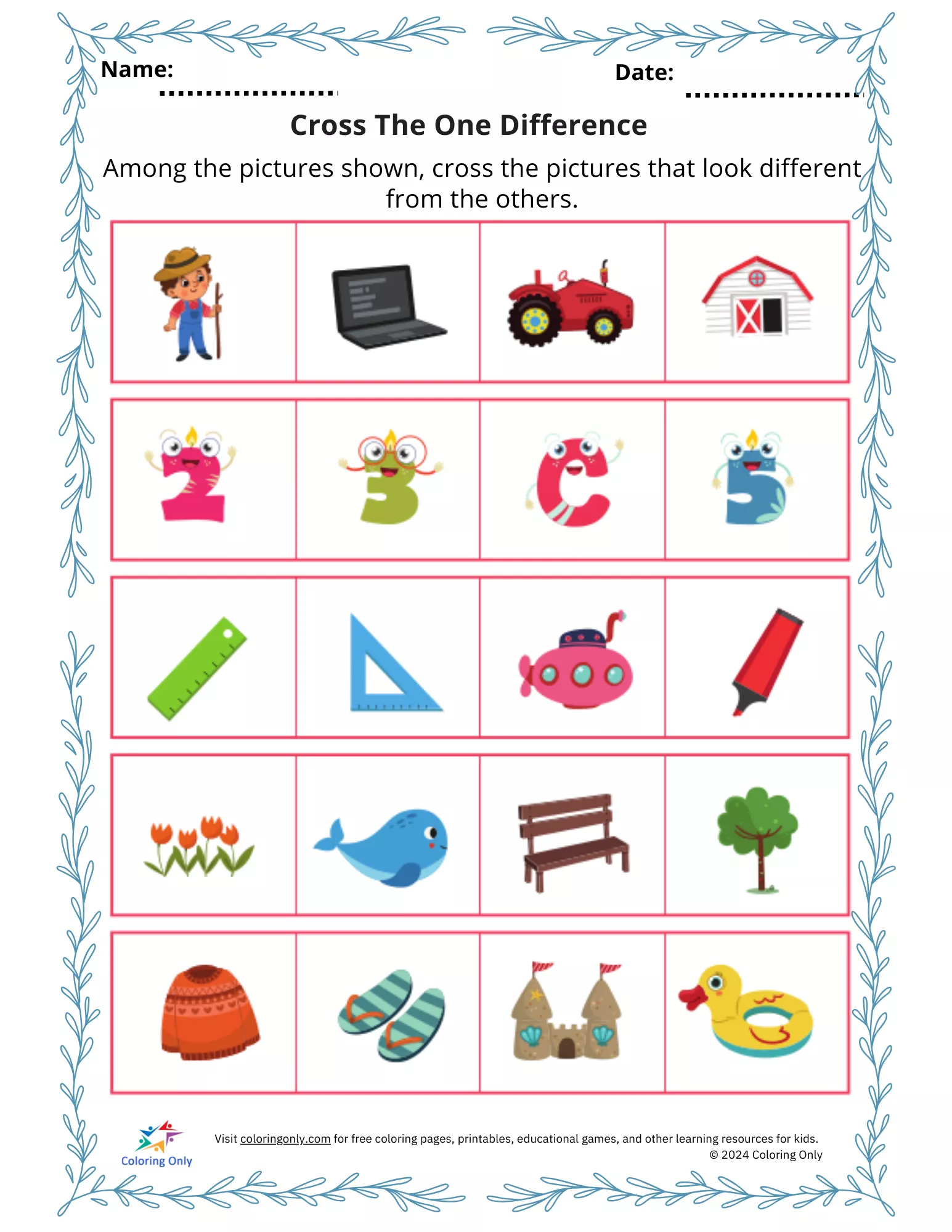 Preschoolers develop their observation skills with this Cross The One Difference Free Printable Worksheet! This fun and interactive activity encourages kids to carefully examine each row of images and cross out the one that looks different. The Cross The One Difference Free Printable Worksheet is perfect for enhancing critical thinking, visual discrimination, and problem-solving skills in an engaging way. Ideal for preschool classrooms, homeschooling, or as a brain-boosting activity at home.