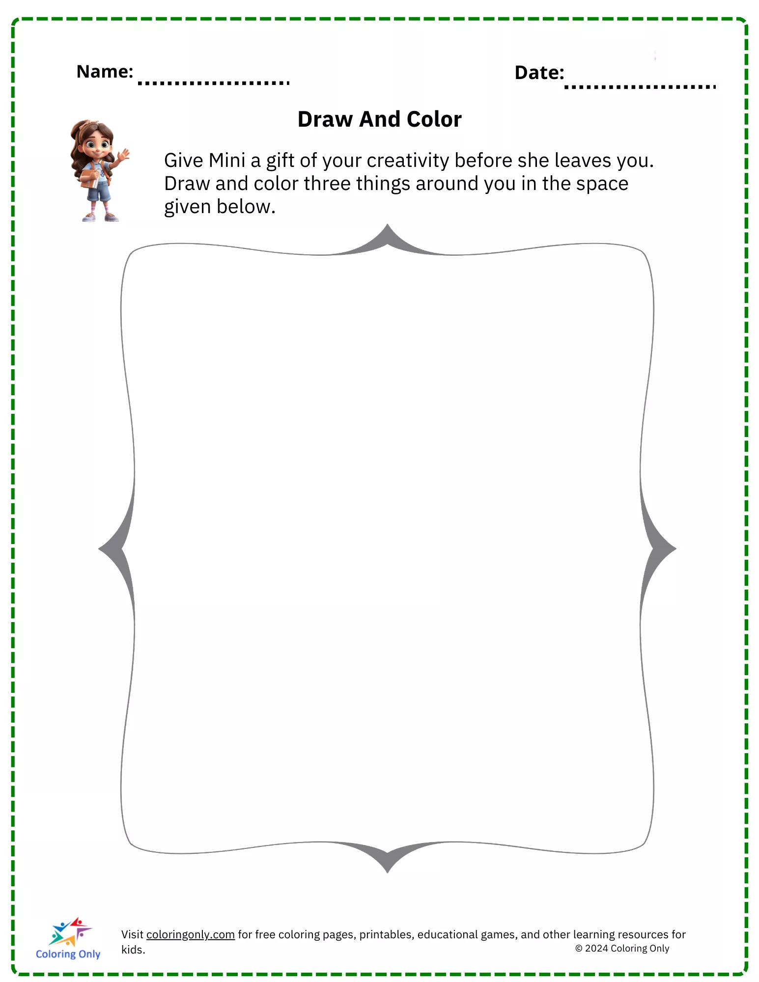 The Draw And Color Free Printable Worksheet is a creative and fun activity designed for preschoolers to enhance their drawing and coloring skills. In this worksheet, children are encouraged to draw and color three objects they see around them, giving them the chance to express their imagination and creativity. This open-ended activity is perfect for developing fine motor skills, visual recognition, and artistic expression in a playful and engaging way. Whether used in the classroom or at home, this worksheet offers a simple yet effective way to boost creativity.