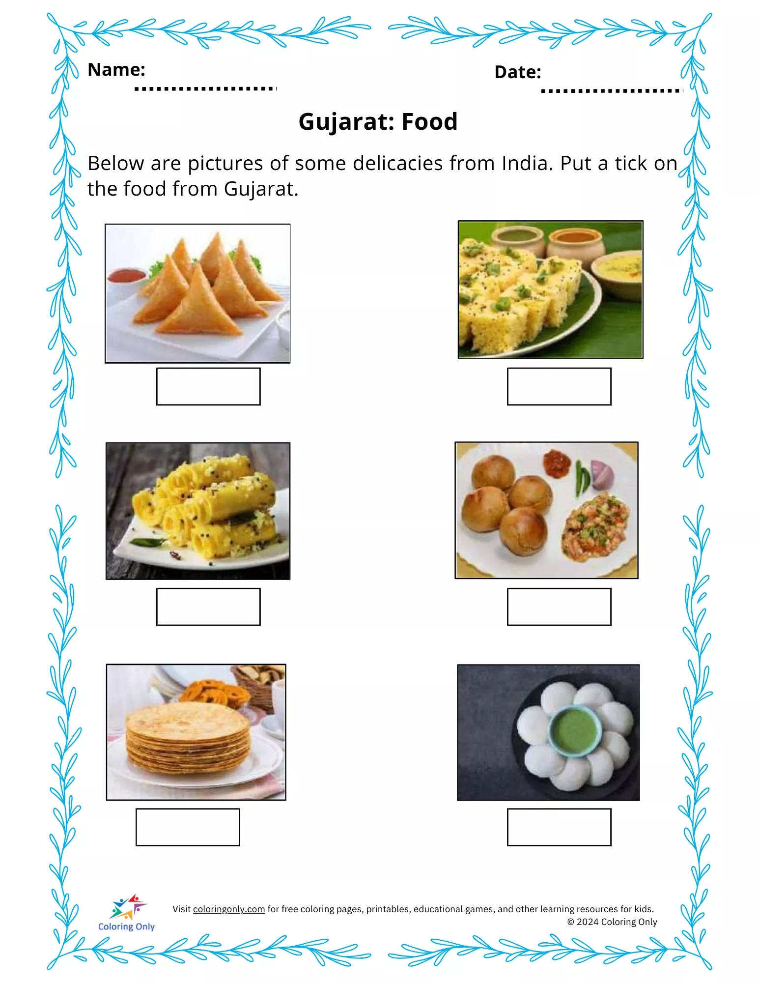 The Gujarat: Food Free Printable Worksheet is an exciting activity for preschoolers to learn about traditional Gujarati cuisine. Featuring pictures of various Indian delicacies, this worksheet asks children to identify and tick the foods that originate from Gujarat. This interactive task enhances cultural awareness, observation skills, and knowledge of regional specialties while keeping kids engaged. The Gujarat: Food Free Printable Worksheet is perfect for incorporating fun learning moments into lessons about Indian states and their cuisines, offering a delightful way for kids to explore Gujarat's rich food culture.