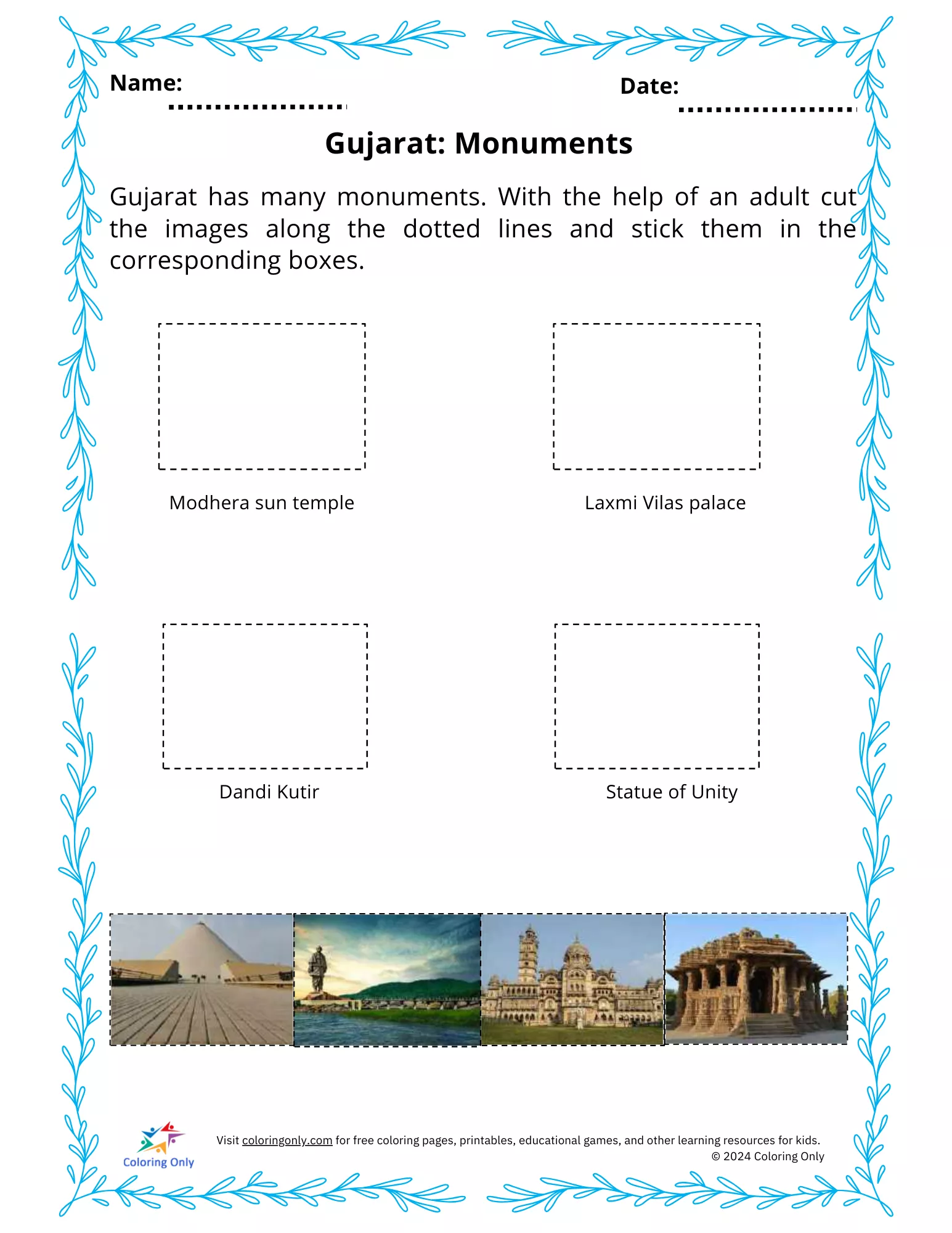 The Gujarat: Monuments Free Printable Worksheet is an interactive activity designed for preschoolers to explore the famous landmarks of Gujarat. This worksheet features images of iconic monuments such as the Modhera Sun Temple, Laxmi Vilas Palace, Dandi Kutir, and the Statue of Unity. Children can cut out the pictures along the dotted lines and paste them into their corresponding boxes with guidance from an adult. The Gujarat: Monuments Free Printable Worksheet introduces young learners to the rich cultural heritage of Gujarat while enhancing their motor skills and boosting their curiosity about historical landmarks.