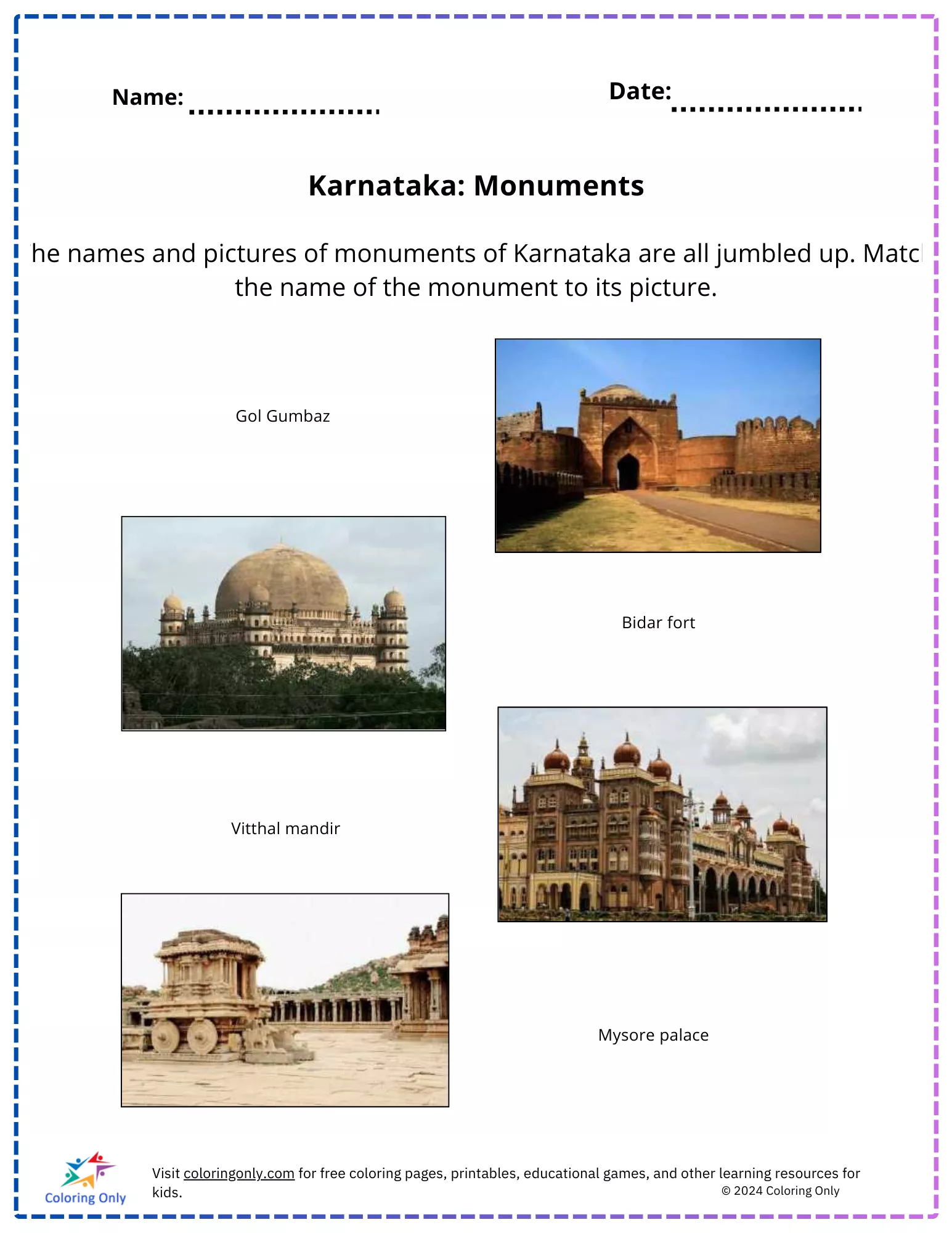 Introduce your preschoolers to the rich cultural heritage of Karnataka with this Karnataka: Monuments Free Printable Worksheet. This engaging worksheet features famous monuments such as Gol Gumbaz, Bidar Fort, Vitthal Mandir, and Mysore Palace. The names and pictures of these monuments are jumbled up, and children are tasked with matching the names to the correct pictures. This activity not only familiarizes young learners with important historical sites but also enhances their matching and recognition skills. Perfect for both classroom and home learning, this Karnataka: Monuments Free Printable Worksheet makes learning about history fun and interactive. Download and print this Karnataka: Monuments Free Printable Worksheet to provide an educational and entertaining experience for your preschoolers.
