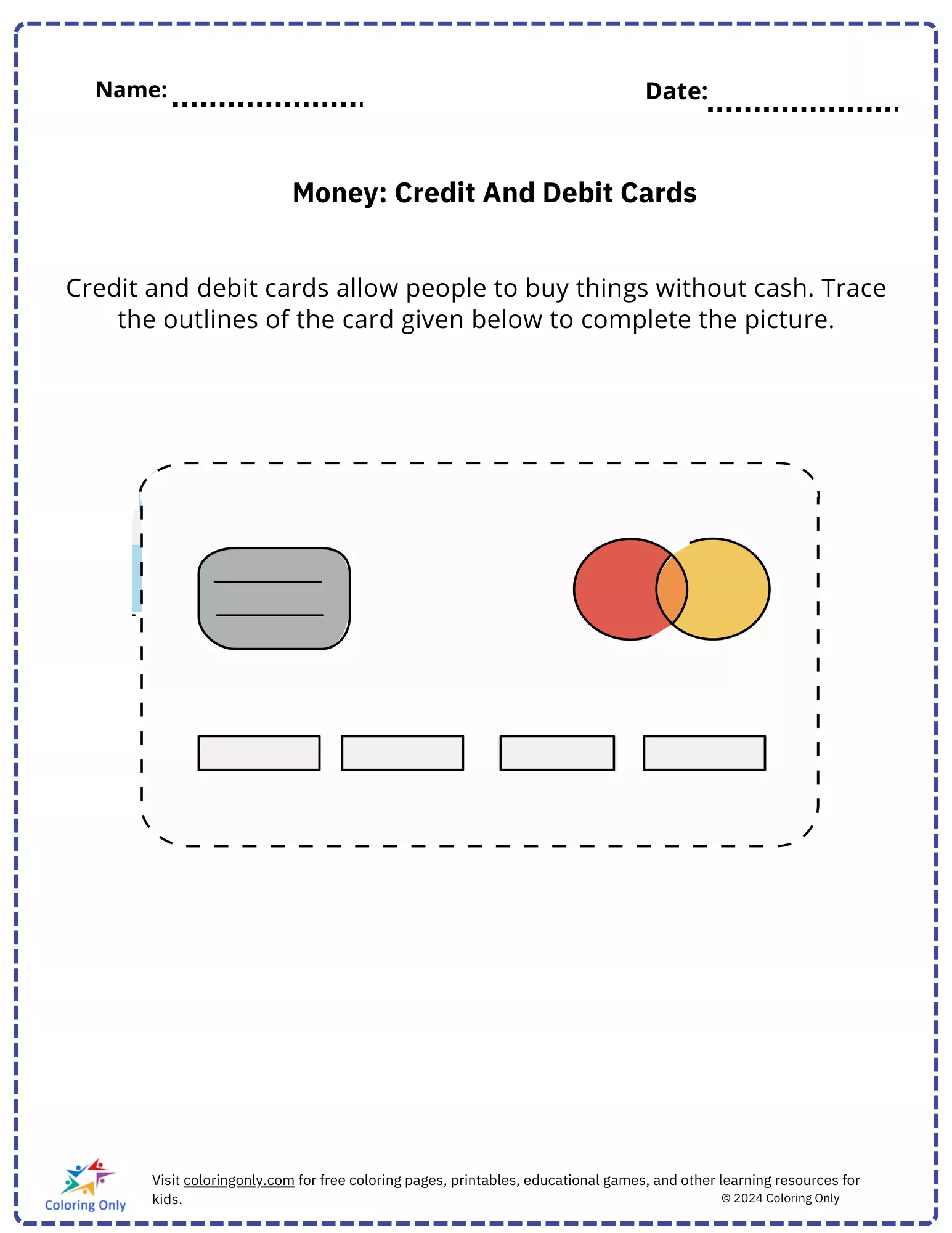 The Money: Credit And Debit Cards Free Printable Worksheet is a great way to introduce preschoolers to the concept of money and modern payment methods. In this activity, children will trace the outline of a credit or debit card to complete the picture. This Money: Credit And Debit Cards Free Printable Worksheet helps kids learn about how people can buy things without using cash, using cards instead. It’s a simple yet effective way to start teaching financial literacy from a young age, while also developing their tracing and motor skills.Preschool