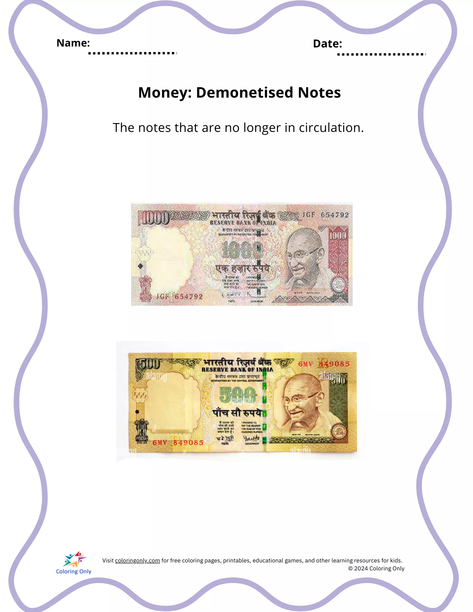 Introduce your preschoolers to the history of currency with the Money: Demonetised Notes Free Printable Worksheet. This engaging worksheet provides images of demonetised Indian notes that are no longer in circulation, sparking curiosity about money and its evolution. It's an excellent resource for parents and teachers to discuss the value of money and the reasons behind changes in currency. The Money: Demonetised Notes Free Printable Worksheet not only enhances recognition skills but also introduces young learners to important economic concepts in a simple, visual manner.