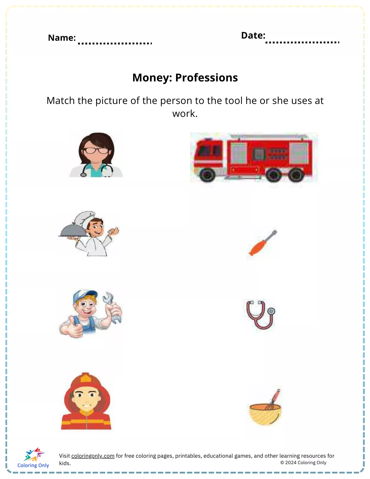 The "Money: Professions Free Printable Worksheet" is an engaging educational activity designed for preschoolers to help them recognize different professions and the tools associated with each. This worksheet invites children to match images of various professionals, such as a doctor, firefighter, chef, and mechanic, with the tools they use at work. By using the "Money: Professions Free Printable Worksheet," young learners can develop their understanding of different job roles and the tools of the trade, fostering cognitive skills and career awareness at an early age. This activity is perfect for introducing kids to the world of work in a fun and interactive way.