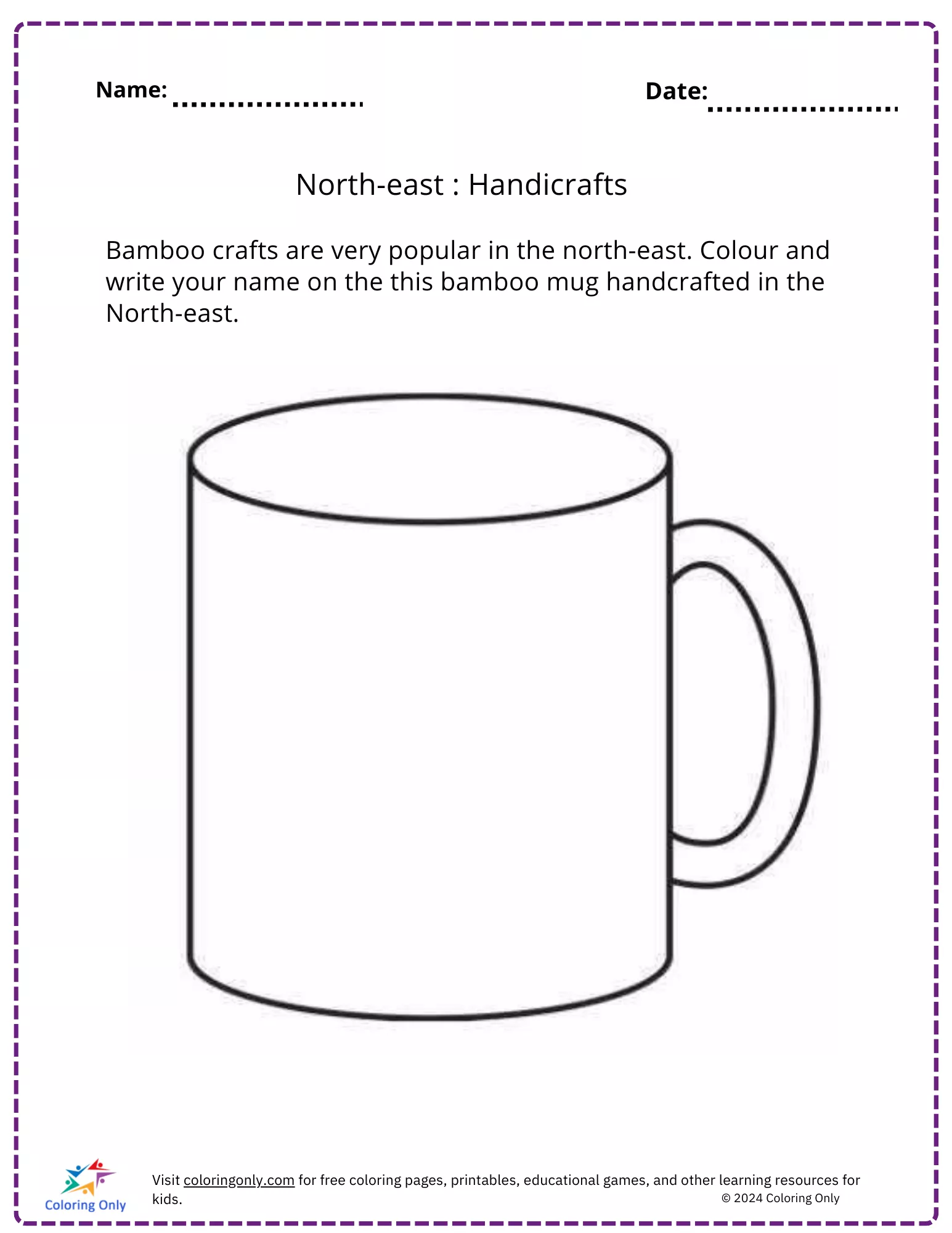 The North-east: Handicrafts Free Printable Worksheet introduces preschoolers to the rich cultural tradition of bamboo crafts from the North-east. In this activity, children can color and decorate a bamboo mug while practicing their writing skills by adding their name on the mug. This North-east: Handicrafts Free Printable Worksheet not only enhances creativity but also provides an early glimpse into the artistry of handicrafts from the North-eastern regions of India. It’s a fun and engaging way for kids to learn about traditional crafts while developing fine motor skills.