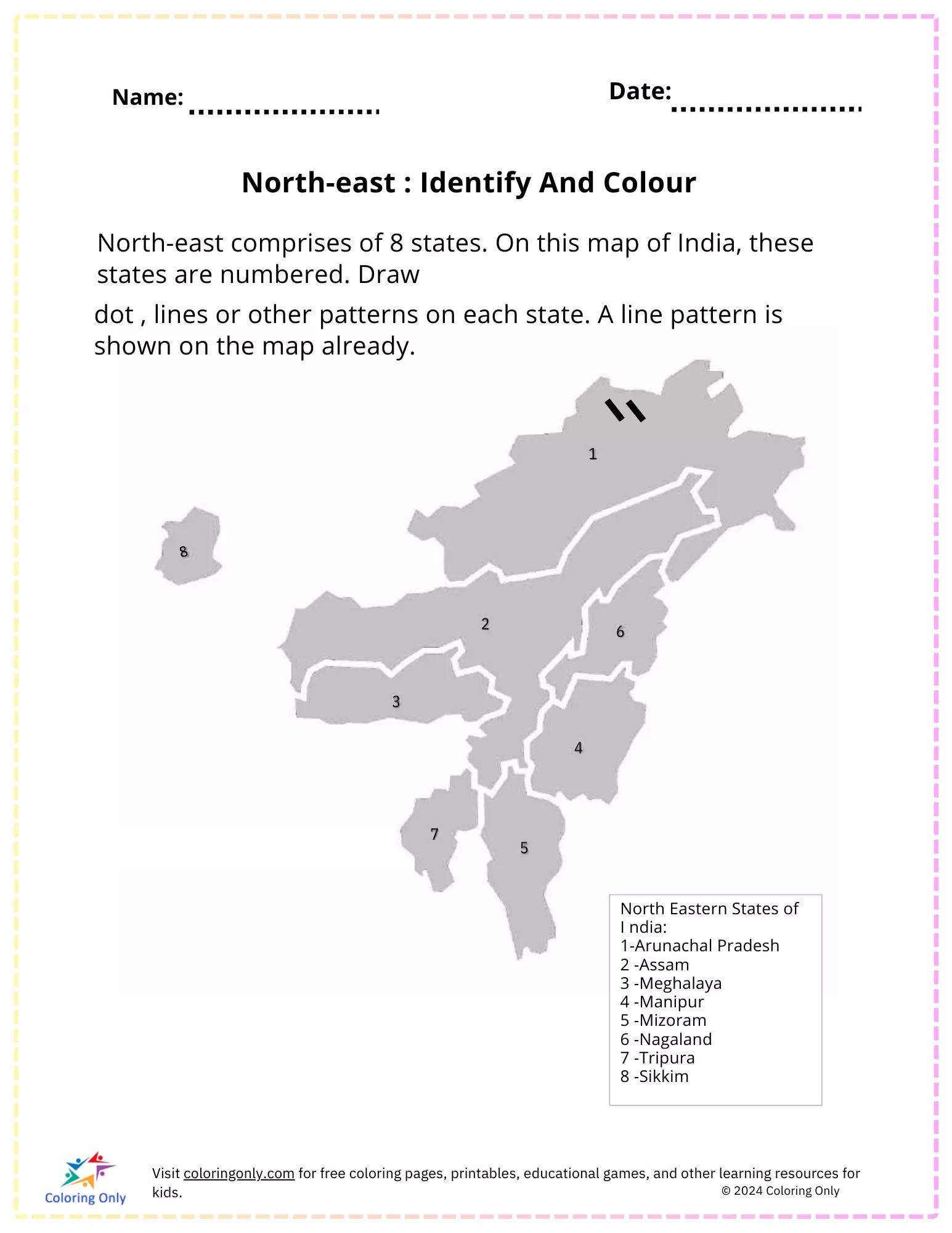 Introduce your preschooler to the geography of India's North-eastern states with this North-east : Identify And Colour Free Printable Worksheet. This activity sheet features a map of the North-east region, highlighting its eight states: Arunachal Pradesh, Assam, Meghalaya, Manipur, Mizoram, Nagaland, Tripura, and Sikkim. Children are encouraged to identify and color each state using dots, lines, or other patterns, enhancing their understanding of regional geography while developing fine motor skills. Perfect for classroom or at-home learning, this North-east : Identify And Colour Free Printable Worksheet offers a fun and educational way to explore India's diverse regions. Download and print this North-east : Identify And Colour Free Printable Worksheet for an engaging and informative activity.