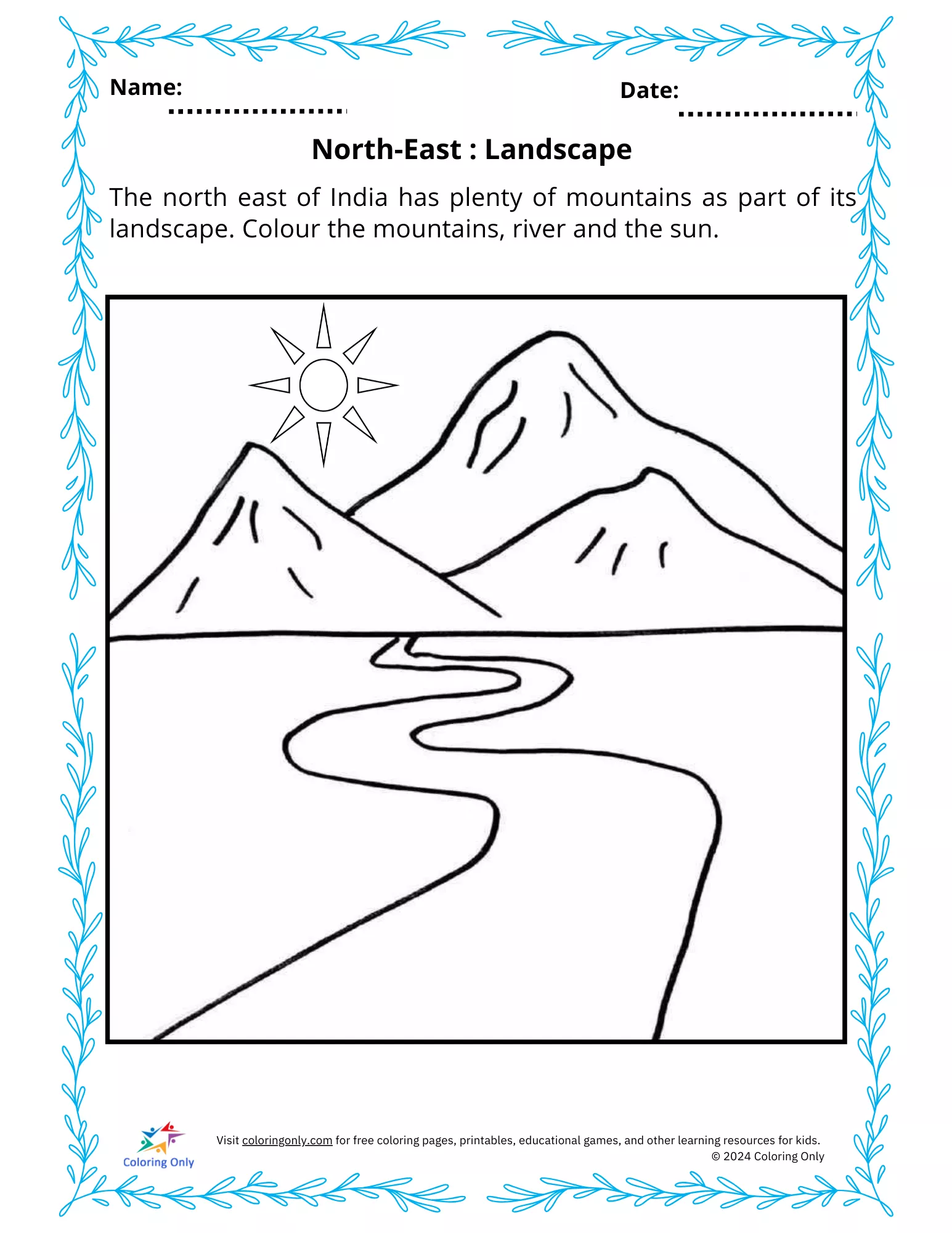 The North-East: Landscape Free Printable Worksheet introduces preschoolers to the scenic beauty of India's northeastern region. This worksheet features a simple outline of mountains, a river, and the sun, encouraging children to use their creativity to color these natural elements. It not only enhances fine motor skills but also provides an opportunity to talk about the unique landscapes of the North-East. The North-East: Landscape Free Printable Worksheet is a fun and educational way to foster awareness and appreciation for India's diverse geography while engaging young learners in an artistic activity.