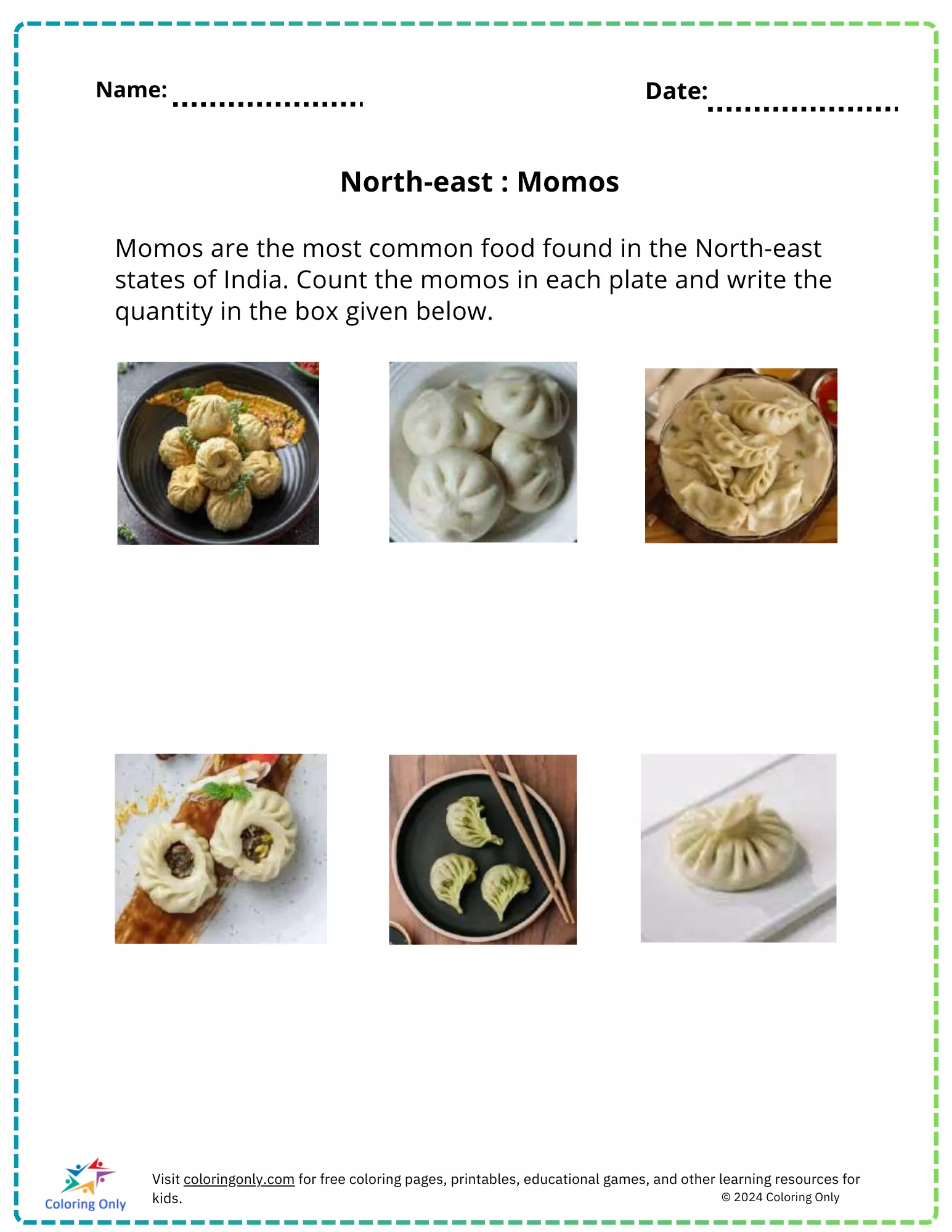 The North-east: Momos free Printable Worksheet introduces preschoolers to the popular dish from the North-eastern states of India—momos. In this engaging activity, children are tasked with counting the number of momos on each plate and writing the quantity in the designated boxes. This worksheet is an excellent way for young learners to practice counting and number recognition while also learning about regional foods. Perfect for a fun and educational session!