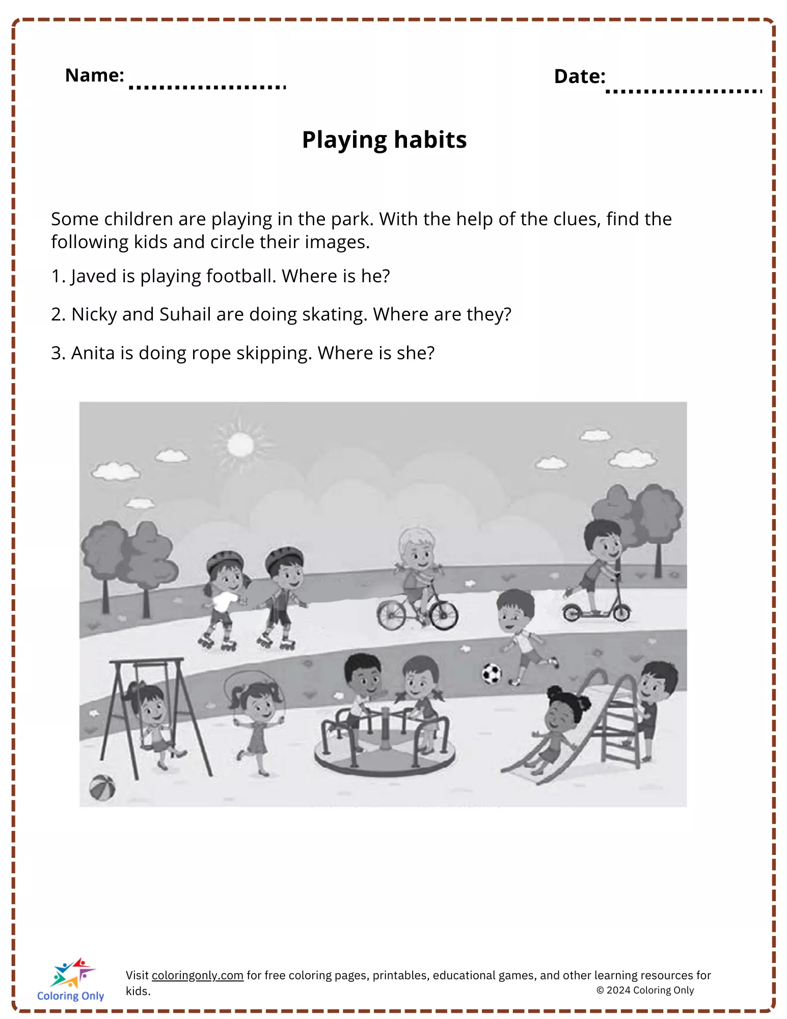 The Playing habits free Printable Worksheet is an engaging activity designed to help preschool children enhance their observation skills while having fun. In this worksheet, kids are given clues to identify different children playing in a park and must circle the correct images. They will search for Javed playing football, Nicky and Suhail skating, and Anita skipping rope. This Playing habits free Printable Worksheet promotes cognitive development, helps children follow instructions, and improves their ability to match descriptions with visual cues. It's an excellent tool for teaching children about different outdoor activities and the importance of active play.