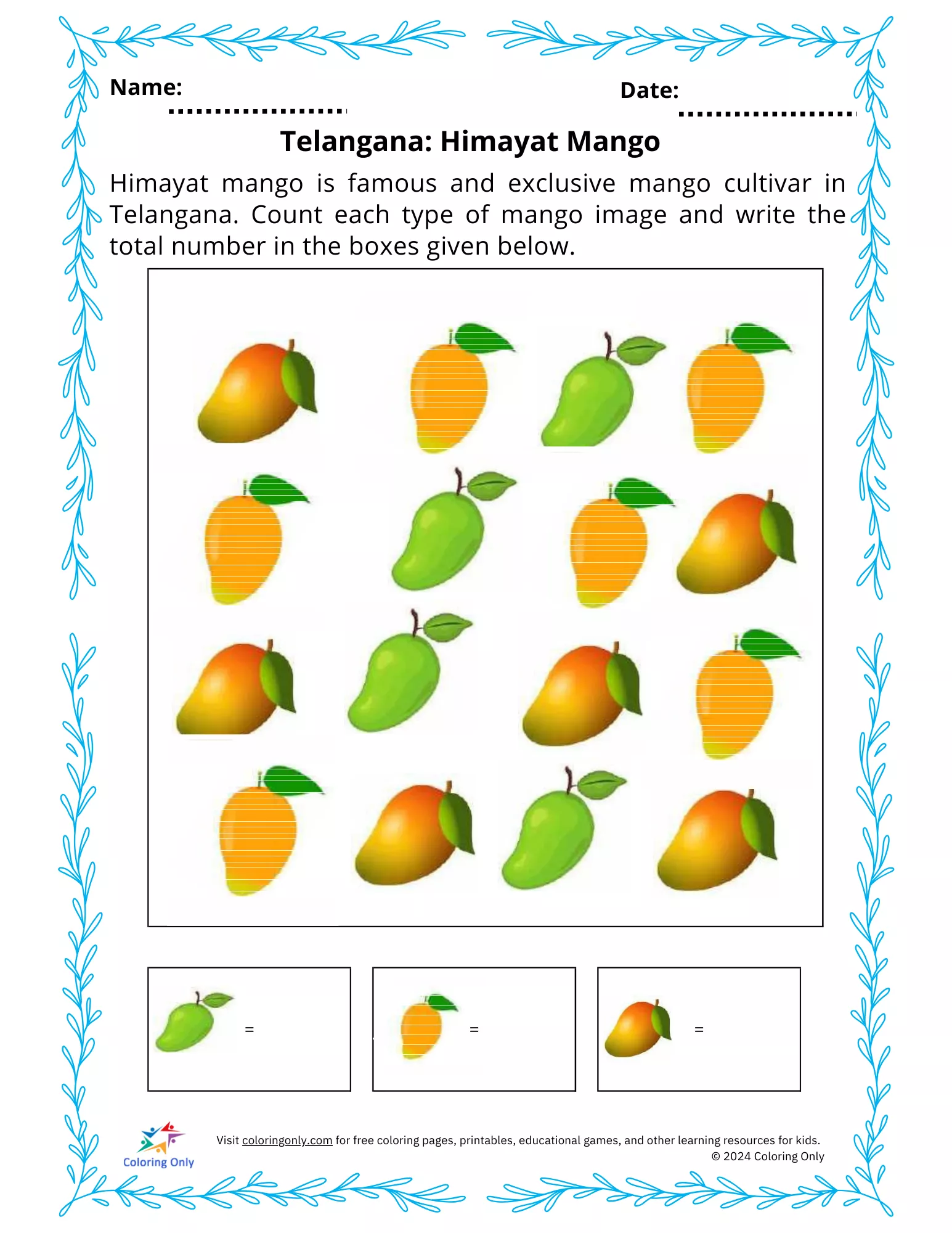 The Telangana: Himayat Mango Free Printable Worksheet is an engaging activity for preschoolers to learn about the exclusive Himayat mango cultivar from Telangana. This worksheet encourages children to observe and count the different types of mango images and write the total numbers in the boxes provided. It blends cultural knowledge with basic counting skills, fostering early numeracy and awareness of regional specialties. The Telangana: Himayat Mango Free Printable Worksheet is perfect for introducing young learners to unique fruits while making learning fun and interactive.