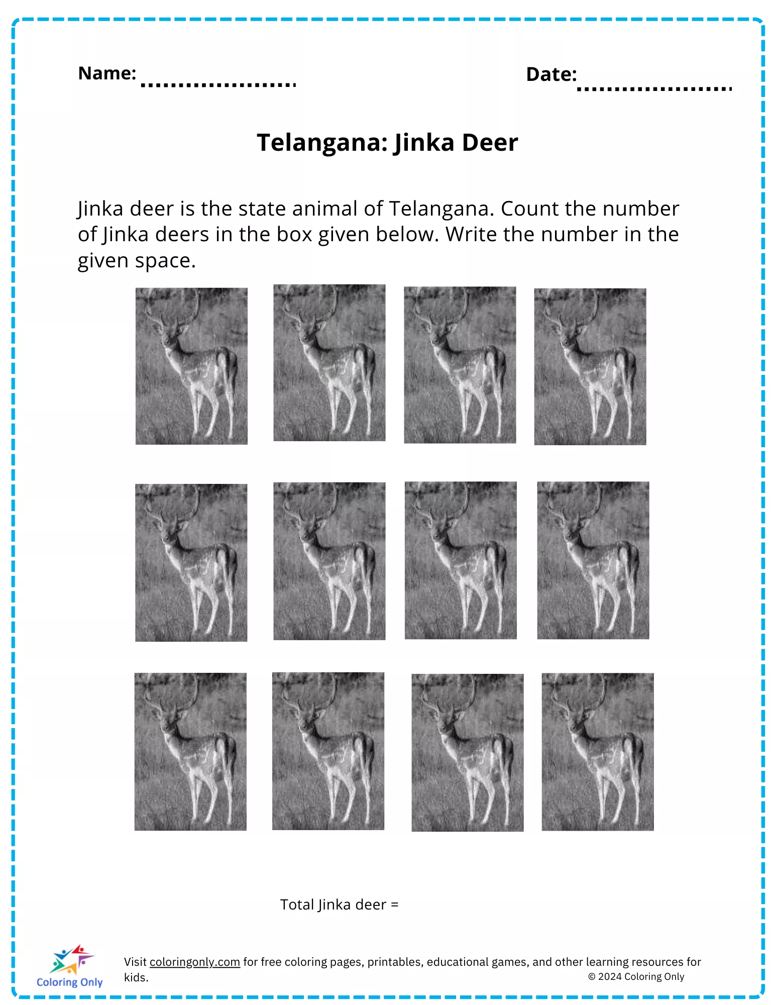 The Telangana: Jinka Deer Free Printable Worksheet is a fun and educational activity for preschoolers. It introduces children to the Jinka deer, the state animal of Telangana, and helps them practice counting skills. Kids are asked to count the number of Jinka deer in the provided box and write the correct number in the space below. This Telangana: Jinka Deer Free Printable Worksheet not only enhances math skills but also familiarizes young learners with wildlife and state symbols, making it a perfect addition to both classroom and at-home learning.