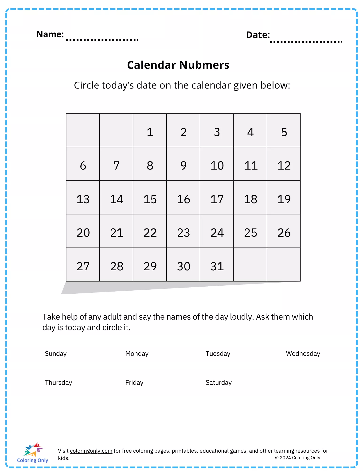 The Calendar Numbers Free Printable Worksheet is an excellent educational resource for preschool children to learn about days and dates in a structured format. This worksheet engages kids in circling today's date and identifying the day of the week with the help of an adult, making it a practical tool for introducing the concept of calendars. It includes a complete set of dates and day names that are perfect for everyday learning. Use the Calendar Numbers Free Printable Worksheet to boost your child's familiarity with numbers and enhance their understanding of how days flow into weeks.