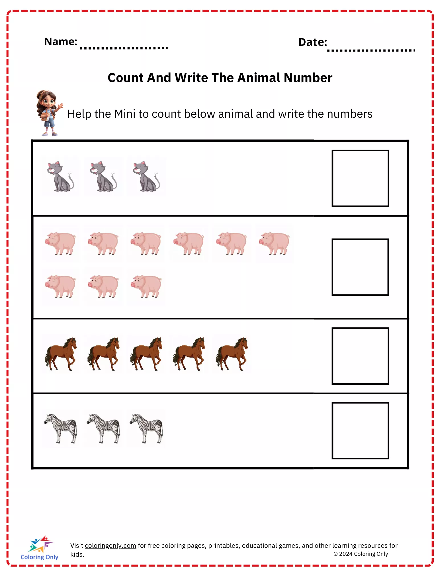 The Count And Write The Animal Number free Printable Worksheet is a fun activity designed to help preschoolers improve their counting skills. Children will count the number of cats, pigs, horses, and zebras in each row and write the correct number in the corresponding box. This interactive worksheet encourages early math development and number recognition, making learning both enjoyable and effective. The Count And Write The Animal Number free Printable Worksheet is perfect for young learners, offering a colorful and engaging way to practice counting.