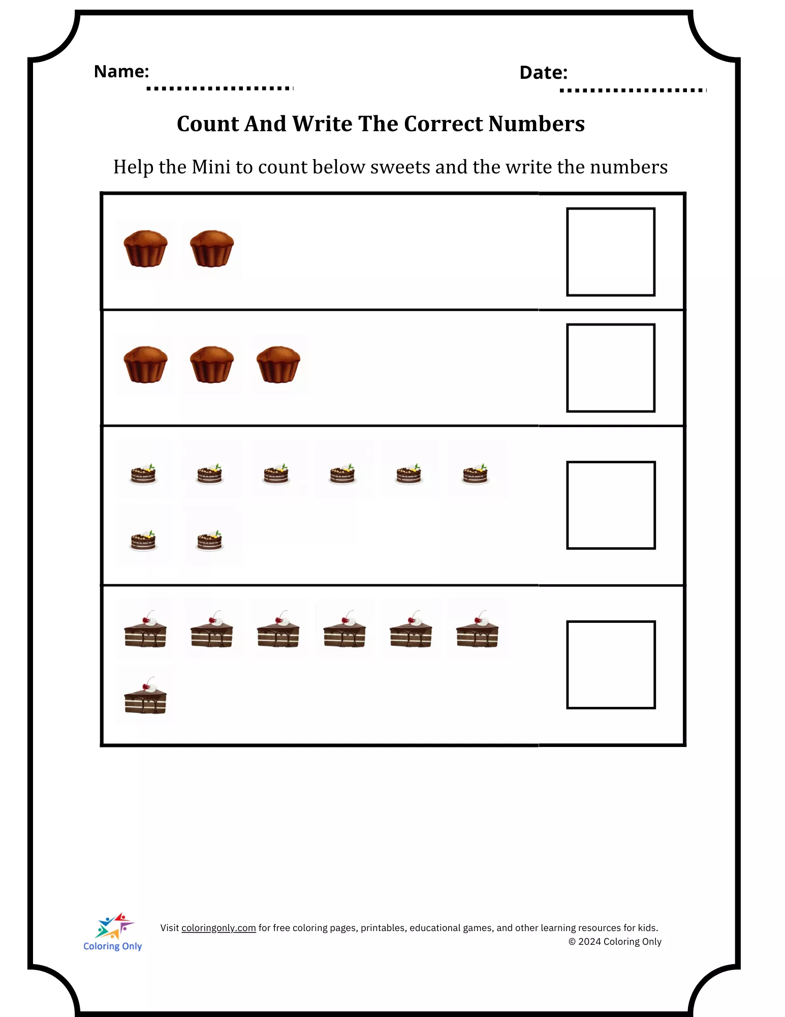 The Count And Write The Correct Numbers Free Printable Worksheet is a fun and interactive activity designed for preschoolers to strengthen their counting and number-writing skills. This engaging worksheet features a variety of sweets, including cupcakes and cakes, to make learning enjoyable. Kids are tasked with counting the sweets in each row and writing the correct numbers in the designated boxes. Perfect for classroom use or at-home practice, the Count And Write The Correct Numbers Free Printable Worksheet helps children develop early math skills in a playful and visually appealing way. It's an excellent resource for teachers and parents to make learning both productive and delightful.
