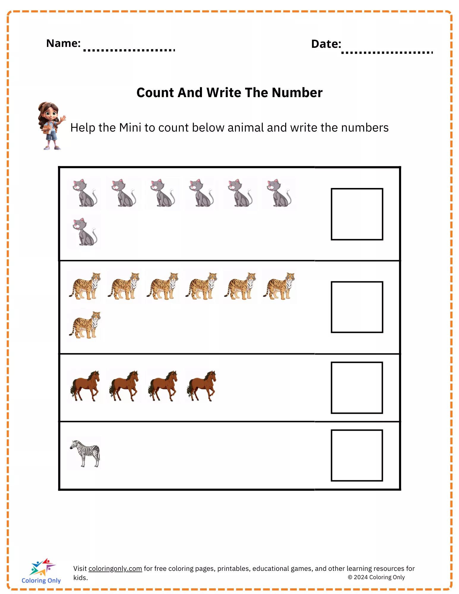 The Count And Write The Number free Printable Worksheet is designed for preschoolers to help them develop counting skills and number recognition. In this worksheet, children will count the number of cats, tigers, horses, and zebras in each row, then write the correct number in the blank boxes provided. This engaging and colorful activity makes learning numbers fun and interactive. The Count And Write The Number free Printable Worksheet provides an excellent way for young learners to practice their math skills while enjoying a playful counting experience.