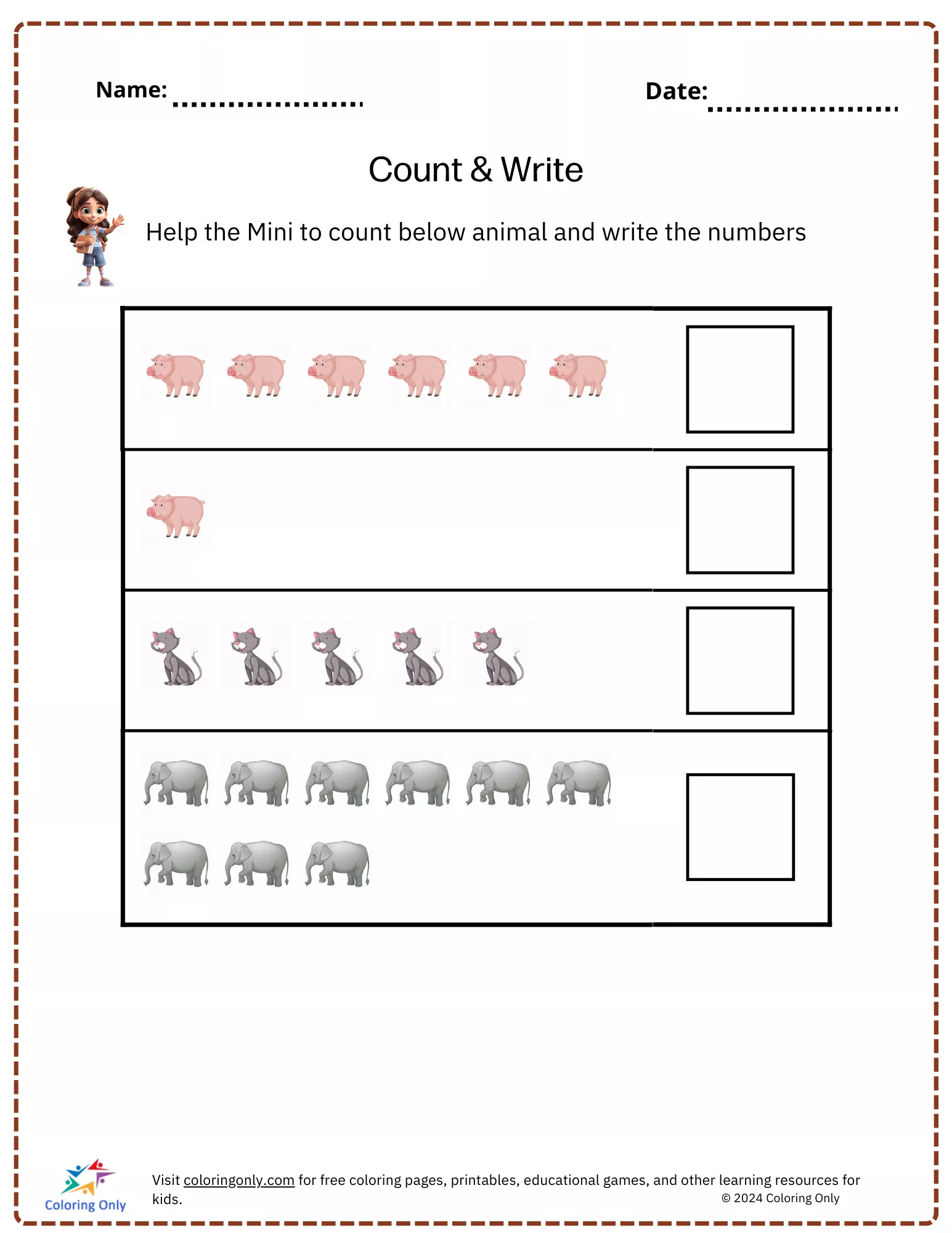 This Count & Write Free Printable Worksheet is designed to help preschoolers practice their counting skills. Children will count the number of pigs, cats, and elephants and write the correct number in the provided boxes. It's a fun, interactive way to develop early math skills and number recognition. This Count & Write Free Printable Worksheet is perfect for engaging young learners in a playful yet educational activity, helping them reinforce counting while enjoying the colorful animal illustrations.