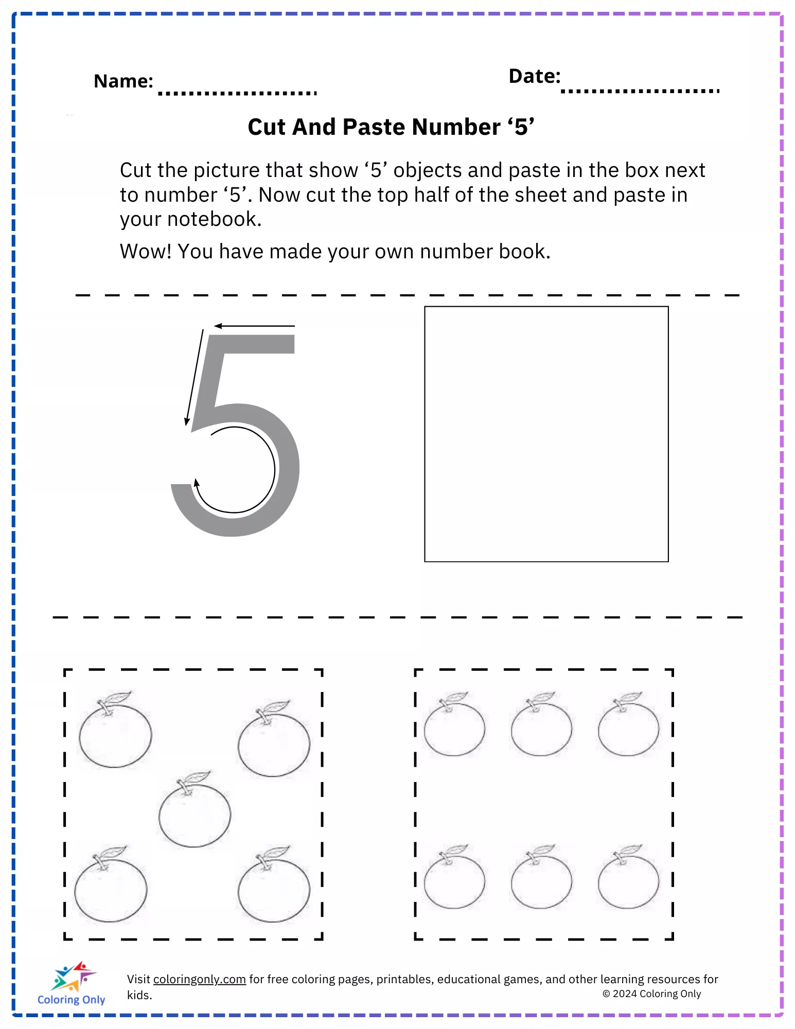 Introduce your preschoolers to the number 5 with this engaging "Cut And Paste Number ‘5’ Free Printable Worksheet." This activity encourages children to cut out pictures that show five objects and paste them in the designated box next to the large number 5. Not only does this worksheet help with number recognition, but it also enhances fine motor skills and hand-eye coordination. The "Cut And Paste Number ‘5’ Free Printable Worksheet" is perfect for making learning fun and interactive. Once completed, children can cut out the top half of the sheet and paste it into their notebooks, creating their own personalized number book.