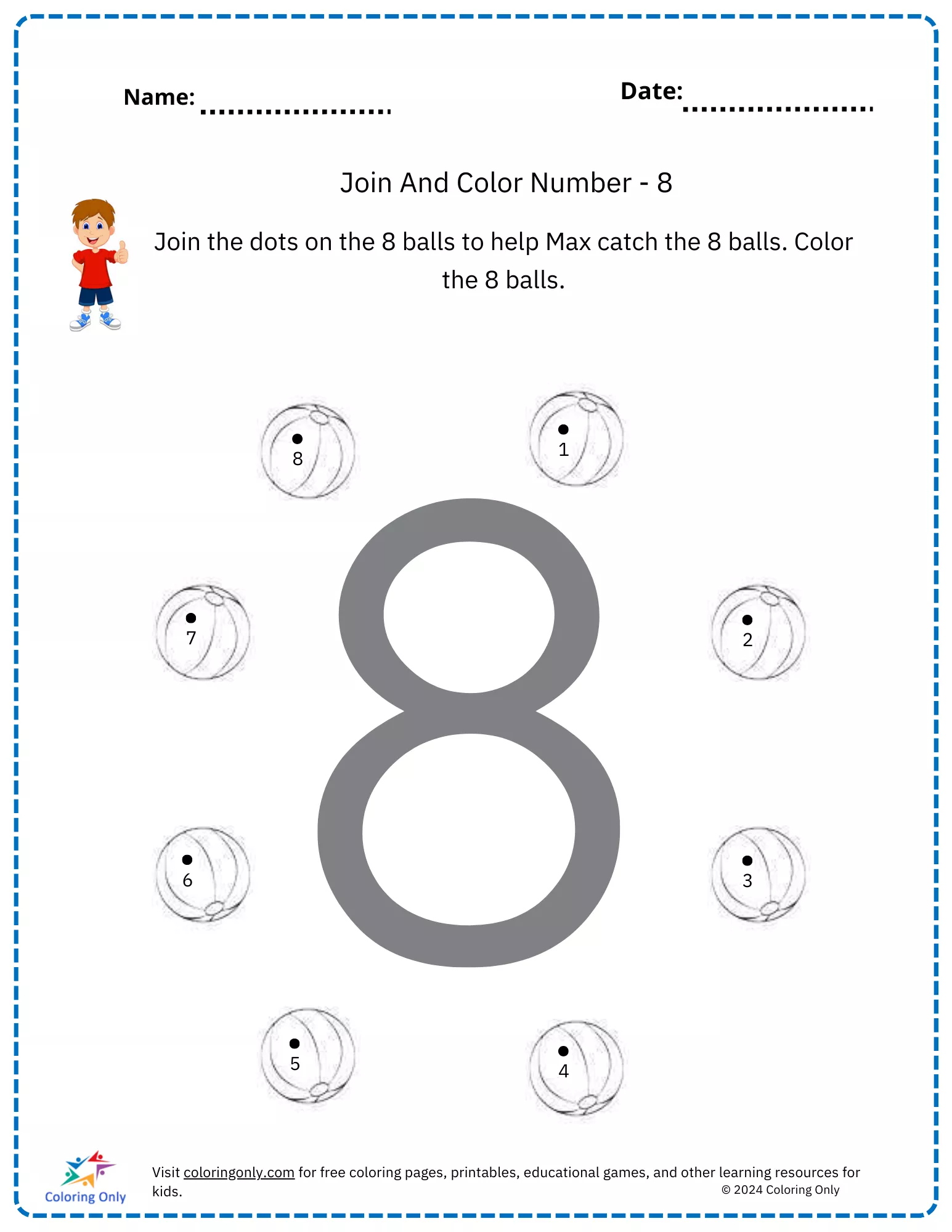 The "Join And Color Number - 8 Free Printable Worksheet" is a fantastic resource for preschoolers to learn and practice the number 8. This engaging activity encourages children to join the dots on 8 balls to help Max catch them, reinforcing their counting skills and number recognition. Once the dots are connected, kids can have fun coloring the 8 balls, combining learning with creativity. This worksheet not only makes learning numbers enjoyable but also helps in developing fine motor skills through dot-to-dot tracing and coloring. The "Join And Color Number - 8 Free Printable Worksheet" is perfect for early learners and is an excellent addition to any preschool curriculum.