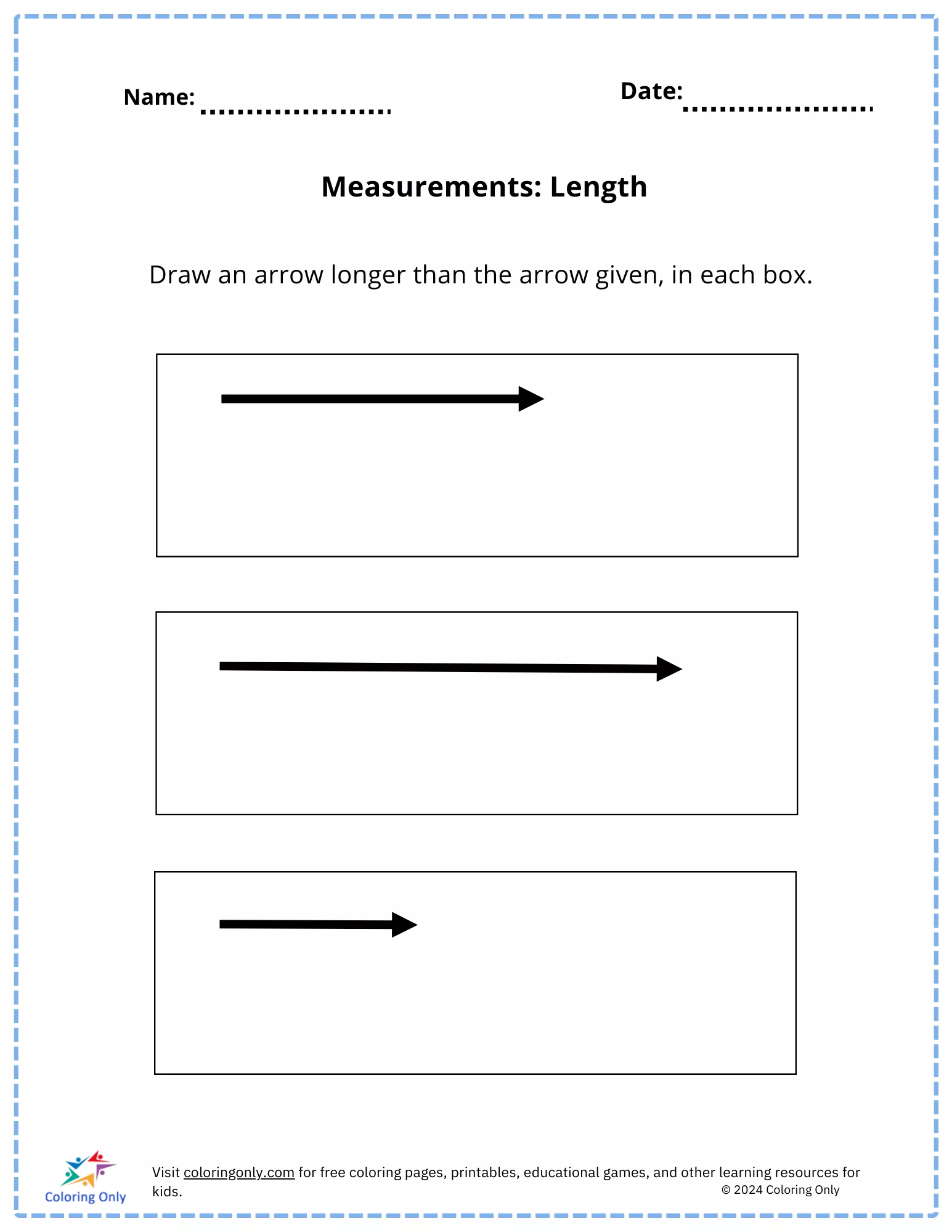 This "Measurements: Length Free Printable Worksheet" is a fantastic tool for preschoolers to practice and understand the concept of length comparison. The worksheet asks children to draw an arrow longer than the one provided in each box, helping them develop their skills in comparing and measuring lengths. This hands-on activity encourages creativity while also enhancing fine motor skills. Perfect for early learners, the "Measurements: Length Free Printable Worksheet" makes learning about length fun and engaging, providing a strong foundation for future math concepts.