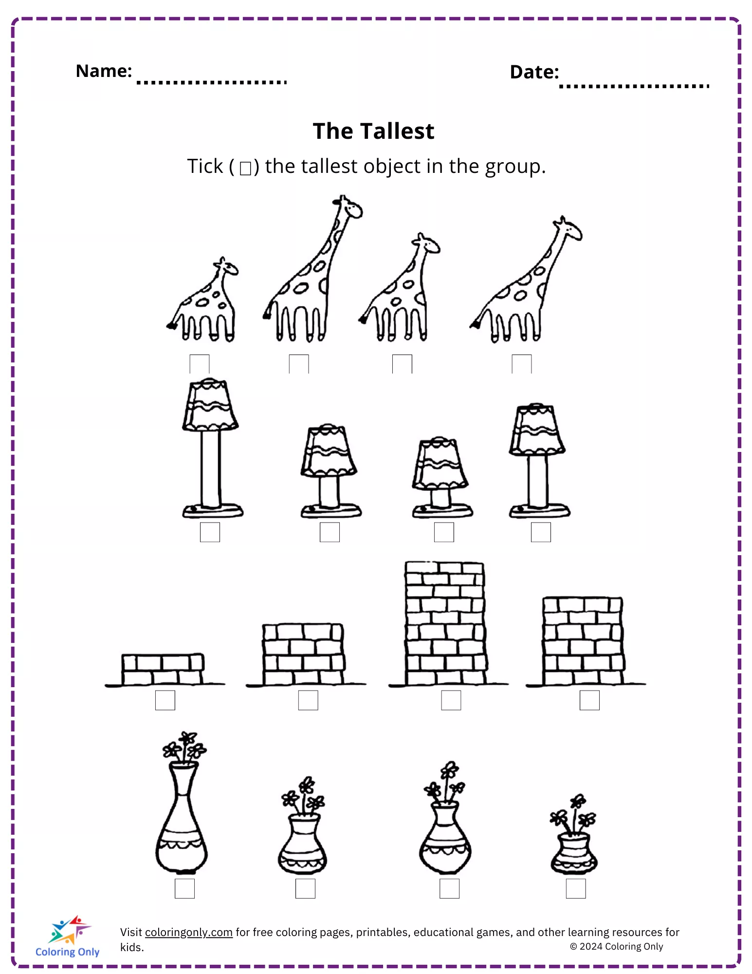 The The Tallest Free Printable Worksheet is a fun and interactive activity designed for preschoolers to help develop their visual comparison skills. In this worksheet, children are asked to identify and tick the tallest object in each group. By observing various objects such as giraffes, lamps, bricks, and vases, young learners can practice their ability to distinguish between heights. This simple yet effective exercise aids in enhancing observation, attention to detail, and cognitive development. The The Tallest Free Printable Worksheet makes learning engaging while introducing fundamental concepts of size comparison.