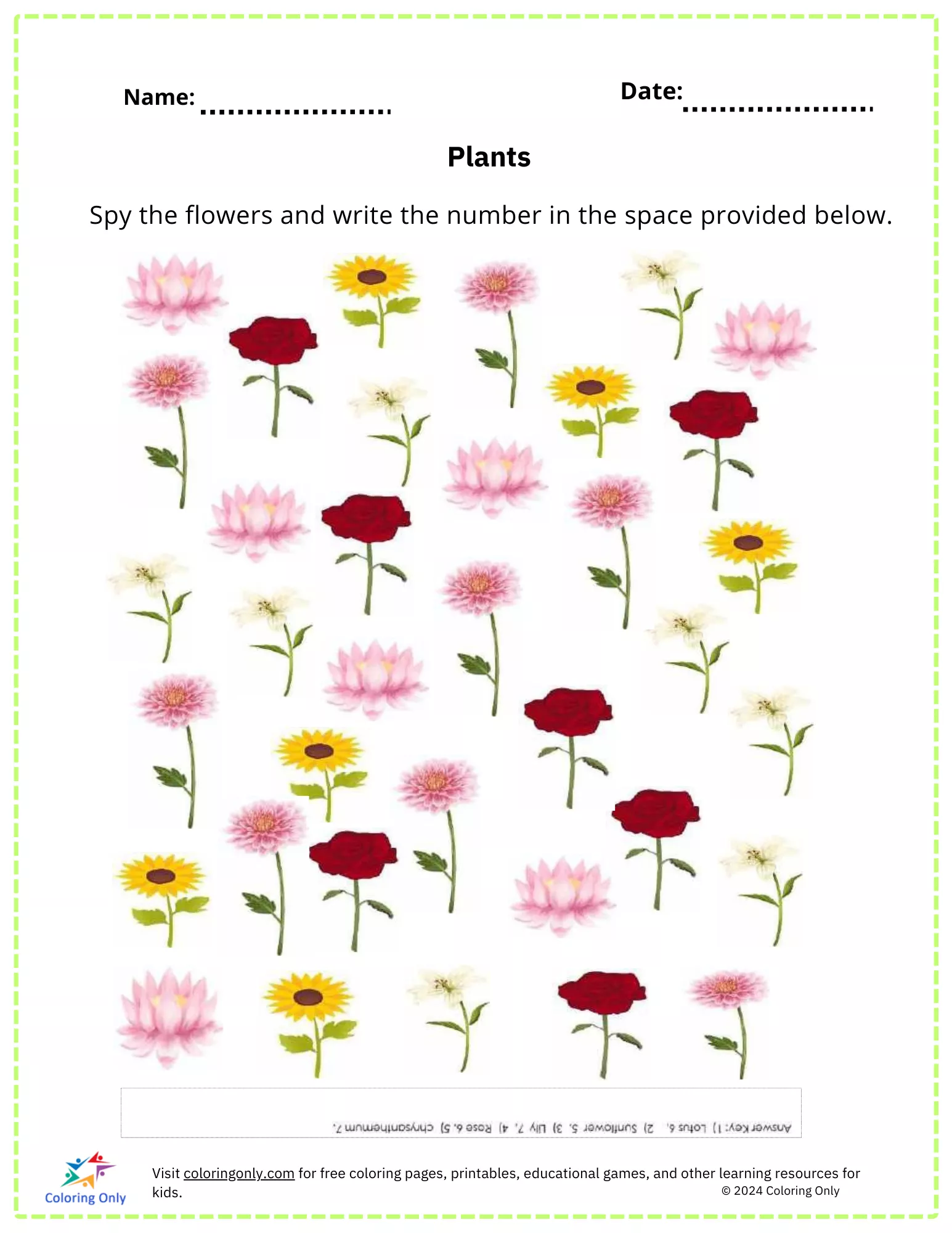 The "Plants Free Printable Worksheet" is an engaging activity designed for preschoolers to enhance their observation and counting skills. In this worksheet, children are tasked with spying different types of flowers and counting how many of each type they can find. They then write the corresponding number in the space provided below. This "Plants Free Printable Worksheet" is not only a fun way to practice counting but also helps young learners develop attention to detail and reinforces their knowledge of various types of flowers. It's a perfect blend of education and entertainment for early learners.
