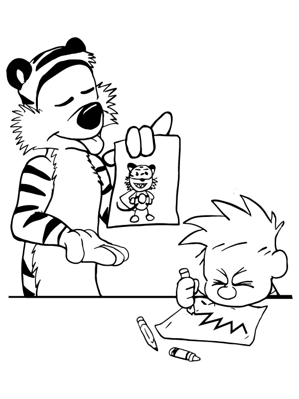 : Download Printable Hobbes ajudando Calvin a praticar desenho Coloring Page