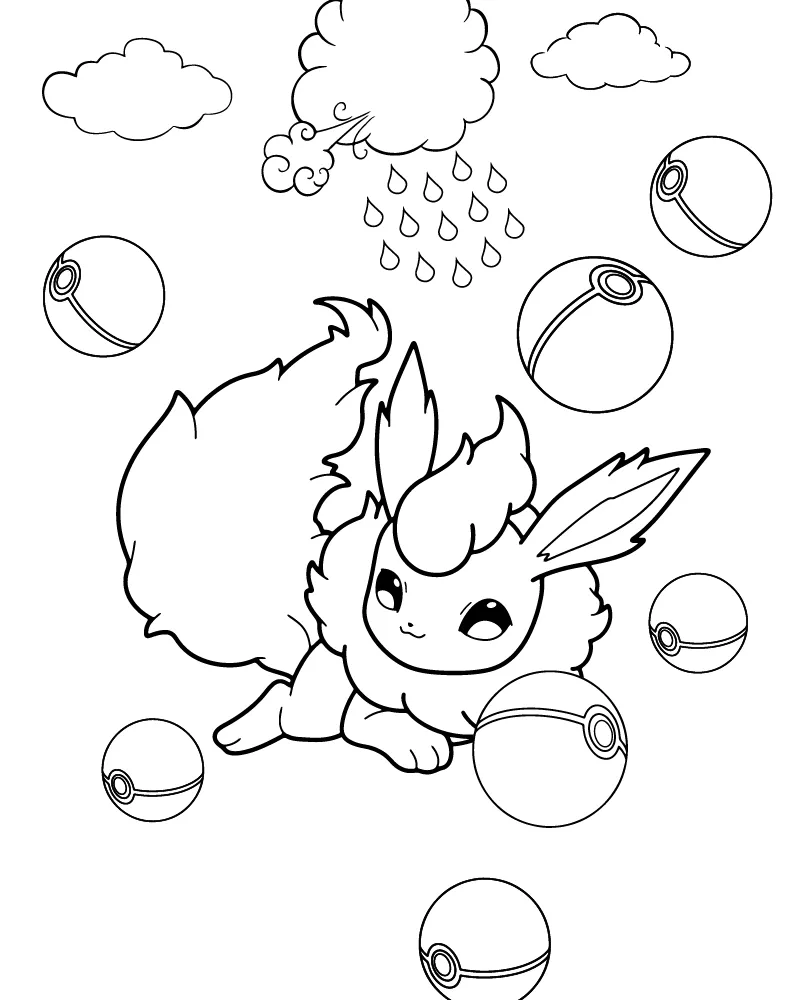 : Download Printable Pokémon Flareon fofo com bolas de Pokémon Coloring Page