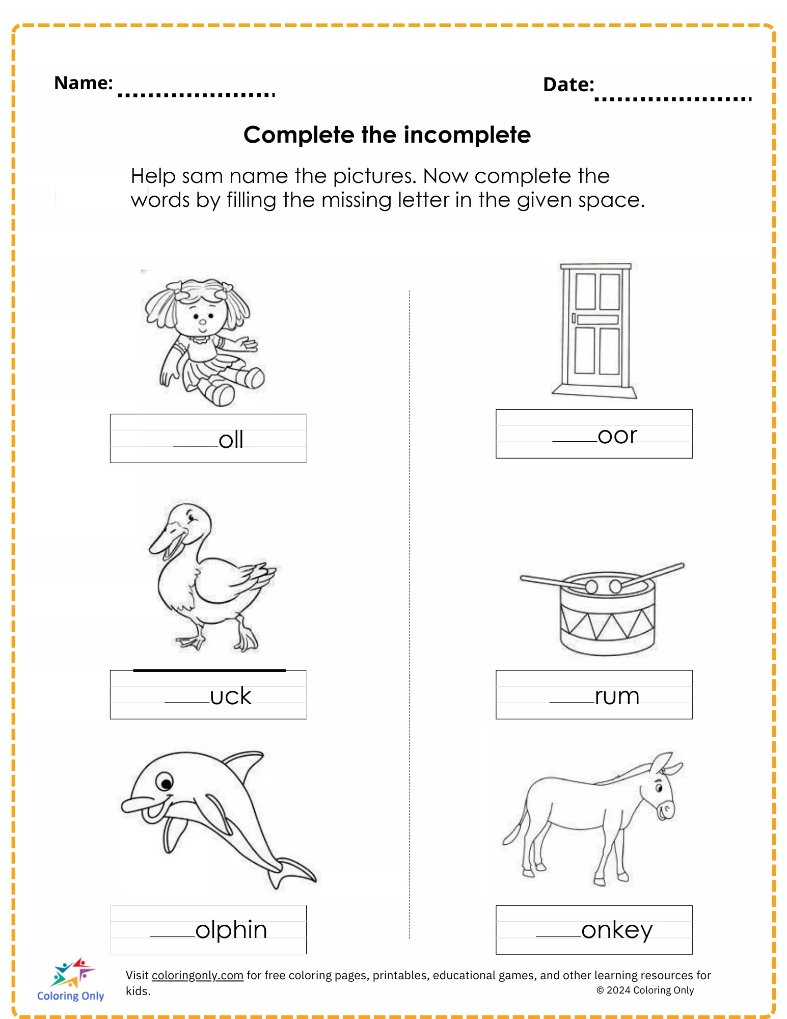 Coloring description : Download Printable Complete the incomplete free Printable Worksheet Coloring Page