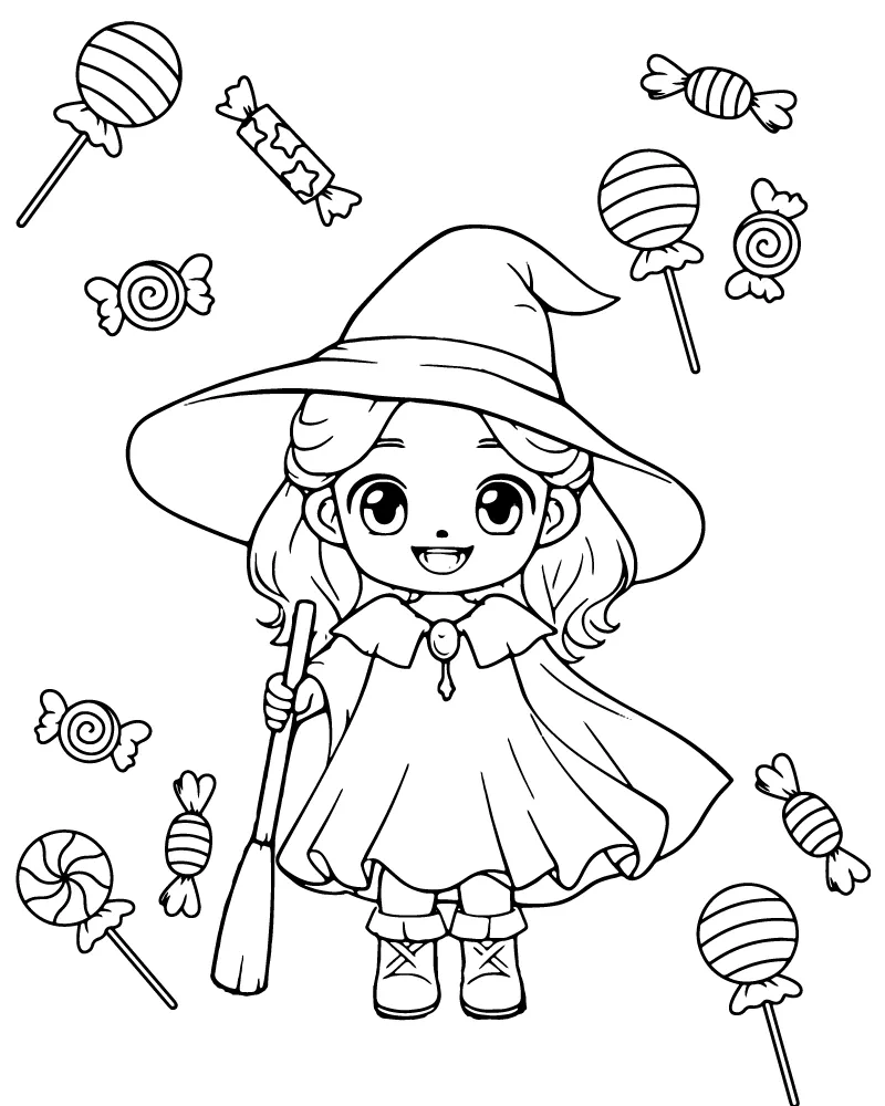 : Download Printable Bruxa simples de Halloween com doces Coloring Page