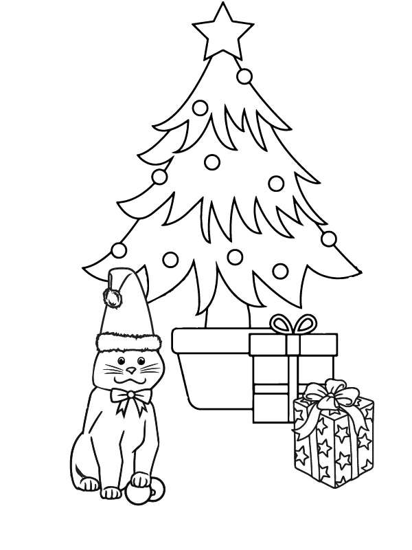 : Download Printable Árvore de Natal e um gato fofo Natal Coloring Page