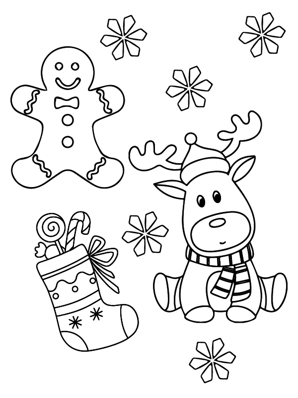 Coloring description : Download Printable Homem de gengibre, rena de Natal e rabisco quente Coloring Page